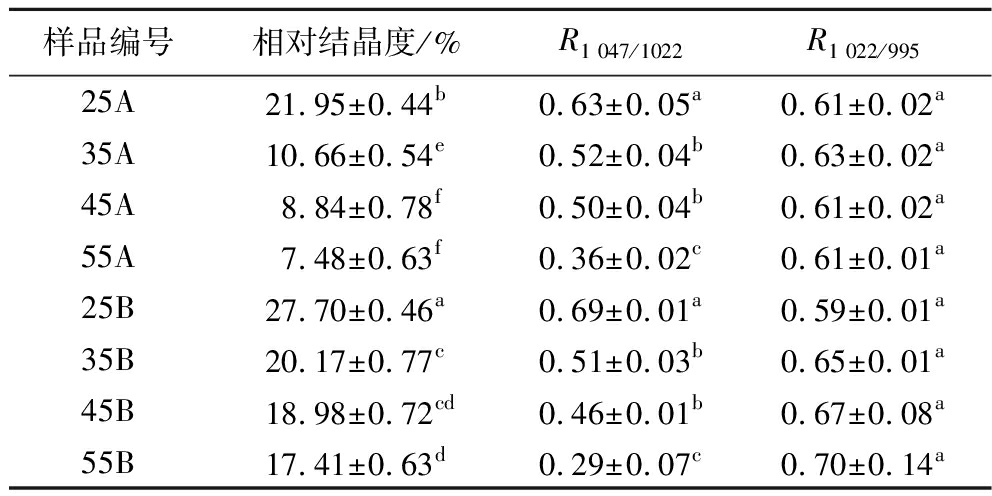 样品编号相对结晶度/%R1 047/1022R1 022/99525A21.95±0.44b0.63±0.05a0.61±0.02a35A10.66±0.54e0.52±0.04b0.63±0.02a45A8.84±0.78f0.50±0.04b0.61±0.02a55A7.48±0.63f0.36±0.02c0.61±0.01a25B27.70±0.46a0.69±0.01a0.59±0.01a35B20.17±0.77c0.51±0.03b0.65±0.01a45B18.98±0.72cd0.46±0.01b0.67±0.08a55B17.41±0.63d0.29±0.07c0.70±0.14a