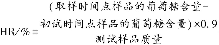 测量血糖生成指数(glycemic index,GI)的方法分为两大类:体内和体外消化法。由于体内测试所需要的志愿者较多,不稳定因素较多,故本实验采用体外消化法测量GI值。体外消化法测定米布丁血糖生成指数依据汤旻玥[15]及彭辉等[16]的方法稍加改动。称取100 mg的样品,加入蒸馏水2 mL,然后将样品放置于50 mL离心管中,水浴(100 ℃,15 min)使样品糊化,再添加13 mL pH 5.2的0.20 mol/L乙酸缓冲液,继续水浴(37 ℃,10 min)至平衡。加入0.2 mL混合酶液(胰α-淀粉酶400 U/mL,糖化酶20 U/mL),在37 ℃ 恒温水浴下振荡(转速为150 r/min),振荡反应时间设置为0、30、60、90、120、180 min,每个时间点分别取0.10 mL上清液经沸水浴5 min灭酶处理,以3 835×g离心5 min。取一定量溶液加1倍的DNS试剂沸水浴5 min,加8倍的蒸馏水于540 nm下测吸光度,通过公式(4)计算产品水解速率(hydrolyzing rate,HR),并绘制淀粉水解曲线: