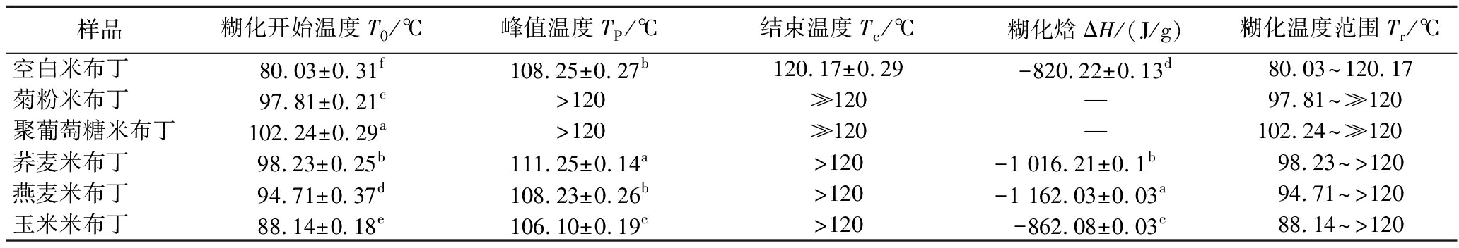 样品糊化开始温度T0/℃峰值温度TP/℃结束温度Tc/℃糊化焓ΔH/(J/g)糊化温度范围Tr/℃空白米布丁80.03±0.31f108.25±0.27b120.17±0.29-820.22±0.13d80.03~120.17菊粉米布丁97.81±0.21c>120≫120—97.81~≫120聚葡萄糖米布丁102.24±0.29a>120≫120—102.24~≫120荞麦米布丁98.23±0.25b111.25±0.14a>120-1 016.21±0.1b 98.23~>120燕麦米布丁94.71±0.37d108.23±0.26b>120-1 162.03±0.03a94.71~>120玉米米布丁88.14±0.18e106.10±0.19c>120-862.08±0.03c88.14~>120