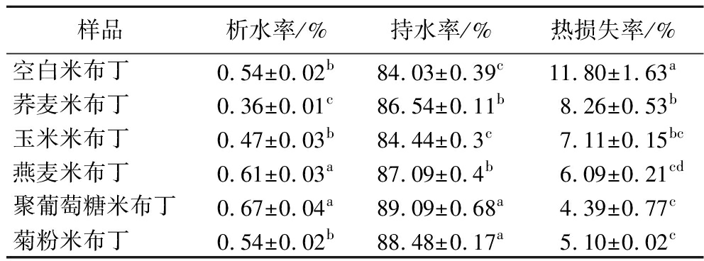 样品析水率/%持水率/%热损失率/%空白米布丁0.54±0.02b84.03±0.39c11.80±1.63a荞麦米布丁0.36±0.01c86.54±0.11b8.26±0.53b玉米米布丁0.47±0.03b84.44±0.3c7.11±0.15bc燕麦米布丁0.61±0.03a87.09±0.4b6.09±0.21cd聚葡萄糖米布丁0.67±0.04a89.09±0.68a4.39±0.77c菊粉米布丁0.54±0.02b88.48±0.17a5.10±0.02c