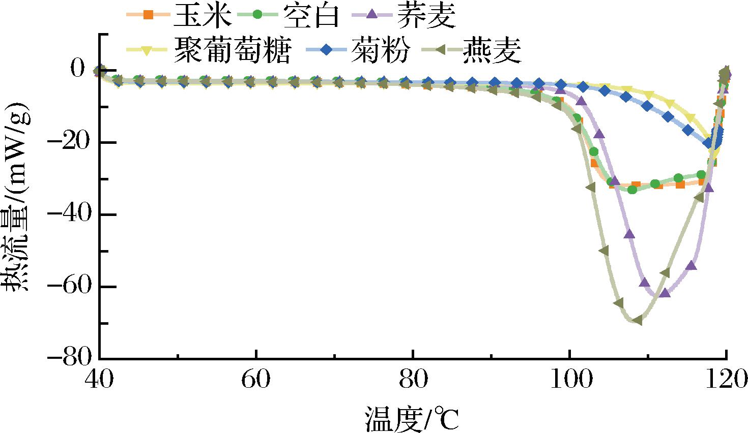 参考WU等[13]的方法,稍作修改。采用差示扫描量热法(differential scanning calorimetry,DSC)对样品进行分析处理,得到各样品的淀粉糊化温度;测试条件:取试样5 mg于铝制干锅中,按m(样品)∶m(水)=1∶1加入纯水,密封后隔夜放置平衡,扫描温度范围为从40 ℃上升到120 ℃,升温速率为5 ℃/min。每个样品做3次平行试验。