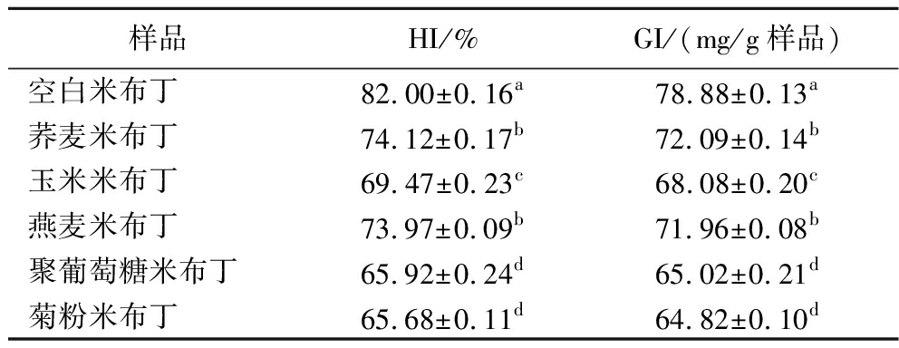 样品HI/%GI/(mg/g样品)空白米布丁82.00±0.16a78.88±0.13a荞麦米布丁74.12±0.17b72.09±0.14b玉米米布丁69.47±0.23c68.08±0.20c燕麦米布丁73.97±0.09b71.96±0.08b聚葡萄糖米布丁65.92±0.24d65.02±0.21d菊粉米布丁65.68±0.11d64.82±0.10d