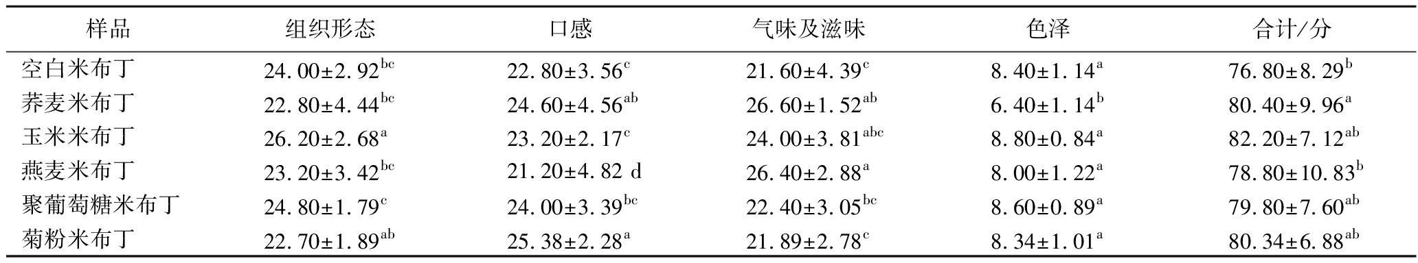 由表2可知,添加不同来源膳食纤维的米布丁基本营养成分的含量与空白组之间的基本营养成分存在差异。其中添加提取源膳食纤维的米布丁其总膳食纤维含量有显著提升,而添加谷物源膳食纤维的米布丁的总膳食纤维含量略有提升,其淀粉含量相对较多,各组蛋白质含量与脂肪含量无显著差异。这是因为淀粉仍为谷物源膳食纤维中最主要的部分,其膳食纤维占比较少(燕麦中β-葡聚糖含量为2.5%~8.3%,荞麦中总膳食纤维含量为8.4%,玉米籽粒中总膳食纤维含量占干物质的6.98%~9.76%),而提取源膳食纤维(聚葡萄糖、菊粉)属于经过加工提取的纯化膳食纤维,对于米布丁的总膳食纤维含量的提升效果更为显著。