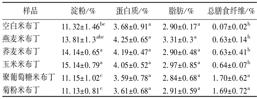 样品淀粉/%蛋白质/%脂肪/%总膳食纤维/%空白米布丁11.32±1.46bc3.68±0.91a2.90±0.17a0.07±0.02b燕麦米布丁13.81±1.3abc4.25±0.65a3.31±0.3a0.63±0.14b荞麦米布丁14.14±0.65a4.19±0.47a2.90±0.48a0.63±0.41b玉米米布丁15.14±0.79a4.05±0.52a2.97±0.85a0.64±0.07b聚葡萄糖米布丁11.15±1.02c3.59±0.78a2.84±0.68a1.70±0.62a菊粉米布丁11.13±0.81c3.61±0.68a2.91±0.59a1.69±0.72a
