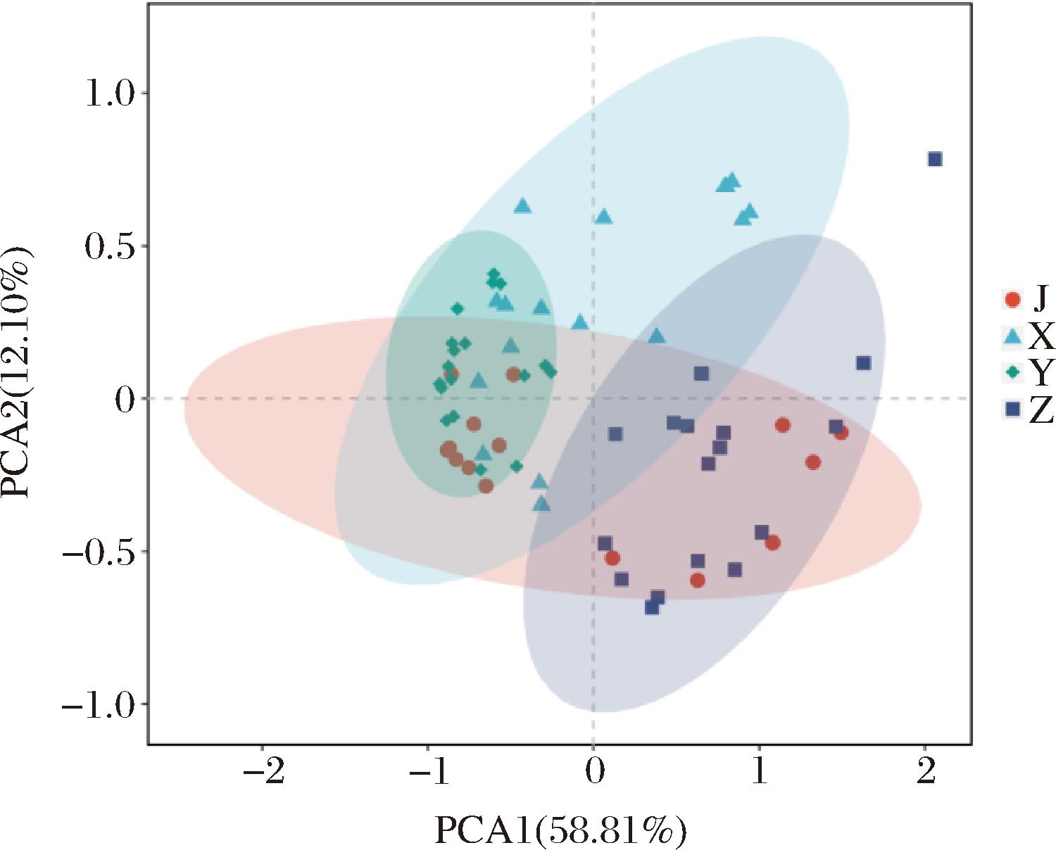 本研究使用主成分分析(principal component analysis,PCA)对69个预制菜样本的微生物群落结构间差异进行可视化分析。通过分解方差,将多组数据的差异反映在二维坐标图上。不同样品的距离可以反映样品的差异,2个样品距离越近,则表示组成越相似。由图3可知,PCA1贡献度为58.81%,是区分微生物群落结构的主要维度,PCA2贡献度为12.10%,PCA1和PCA2累计解释了70.91%的微生物群落变异,说明样本的菌群组成存在显著差异,样本分布对分析具有统计学意义。猪肉类和鸡肉类预制菜主要分布与鱼肉类和虾肉类形成明显分离,说明畜禽类预制菜的微生物群落与水产类差异显著;但猪肉类与鸡肉类在PCA2轴也存在距离,表明两者加工工艺或贮存条件的差异导致微生物群落进一步分化。