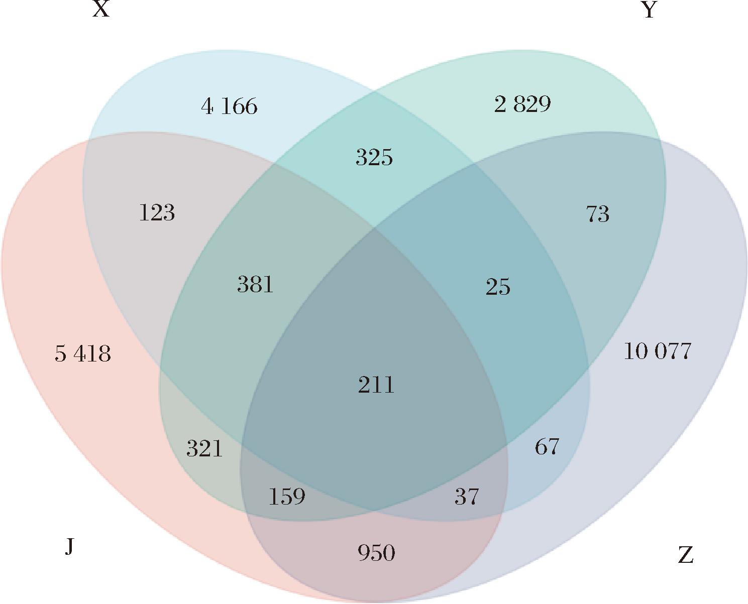 为进一步揭示不同种类预制菜之间共有与特有微生物特征,绘制Venn图(图1)。结果显示,虾肉类、鱼肉类、猪肉类和鸡肉类样本的OTU数目分别为5 335、4 324、11 599、7 600个,其中4种预制菜共有OTU仅为211个,占OTU总数的0.84%(总数25 162)。其中猪肉类特有OTU占总数的40.05%(10 077/25 162),分别是含鱼类、含虾类和含鸡肉类特有OTU的3.56、2.42、1.86倍。这说明猪肉类预制菜的特有微生物明显多于其他类,且四类预制菜均具有各自独特的微生物。