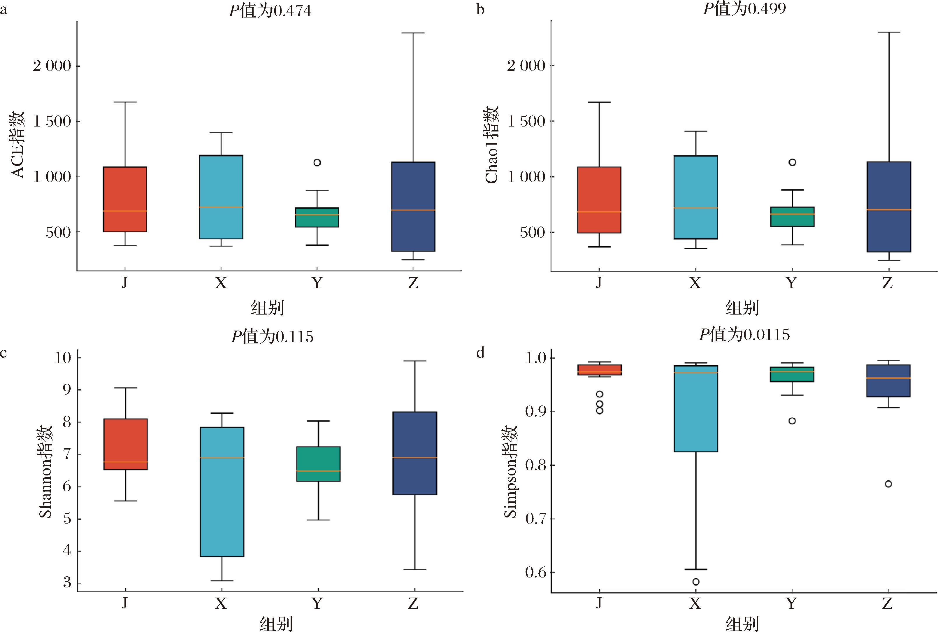 a-ACE指数;b-Chao1指数;c-Shannon指数;d-Simpson指数