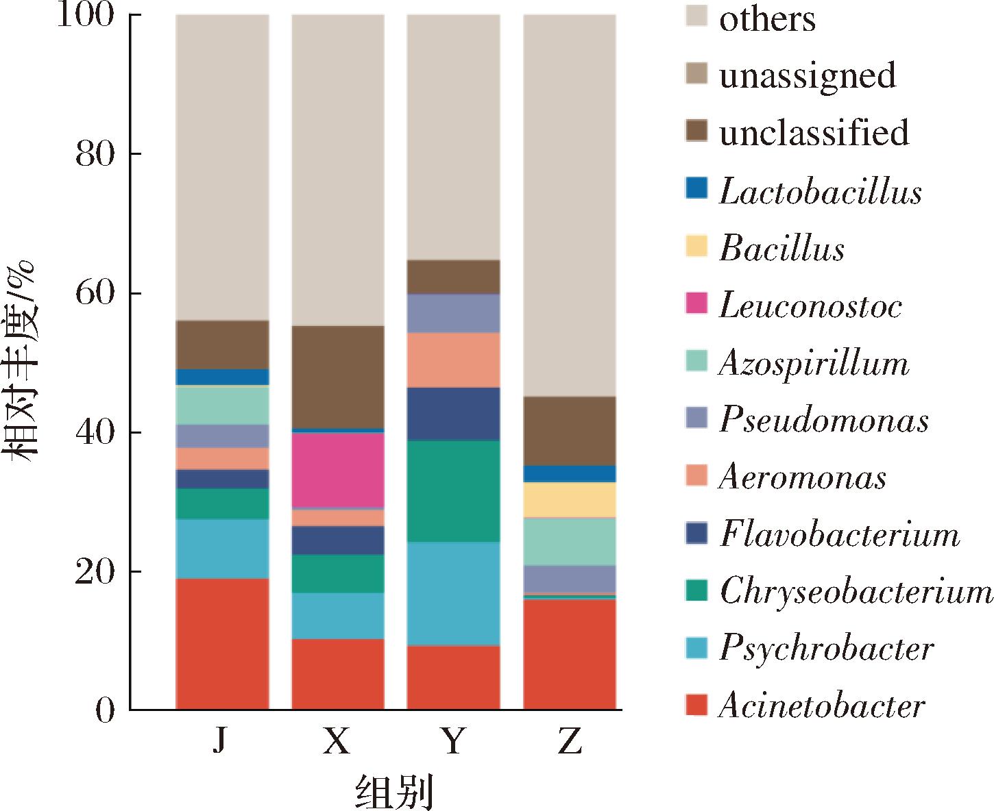 在属水平上对预制菜样品中微生物丰度排名前10的物种进行分析(图5)。结果显示,鸡肉类预制菜中主要优势菌属为不动杆菌属(Acinetobacter,18.90%)、嗜冷杆菌属(Psychrobacter,8.52%)、固氮螺菌属(Azospirillum,5.37%);虾肉类预制菜中主要优势菌属为明串珠菌属(Leuconostoc,10.57%)、不动杆菌属(10.21%)、嗜冷杆菌属(6.67%);鱼肉类预制菜中,主要优势菌属为嗜冷杆菌属(14.88%)、金黄杆菌属(Chryseobacterium,14.65%)、不动杆菌属(9.30%);猪肉类预制菜中,主要优势菌属为不动杆菌属(15.86%)、固氮螺菌属(6.83%)、芽孢杆菌(Bacillus,5.13%)。四类预制菜中优势菌属均含有不动杆菌属,其中鸡肉类预制菜中不动杆菌属丰度最高,虾肉类预制菜含有较高丰度的明串珠菌属,鱼肉类预制菜含有较高丰度的嗜冷杆菌属和金黄杆菌属,猪肉类预制菜含有较高丰度的芽孢杆菌。