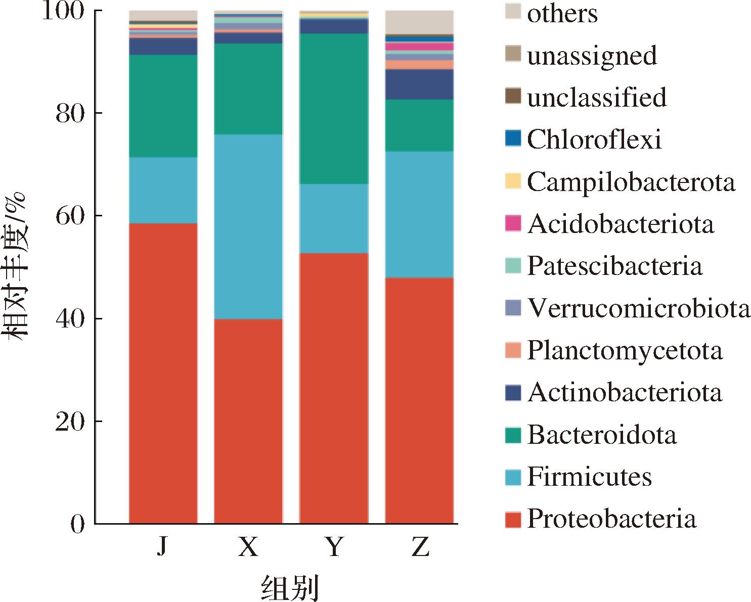 为直观展示不同预制菜样品中微生物群落的组成差异,本研究基于门水平对物种相对丰度进行了柱状图可视化(图4)。为优化视图效果,仅展示丰度排名前10的物种,其余物种统一归类为“others”。
