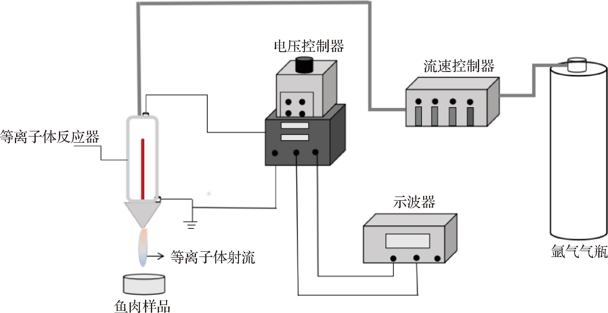 新鲜草鱼重约5公斤,20 min内活体运至实验室。用木棍击打头部致其昏迷后迅速宰杀,去鳞、去内脏、去头及两侧骨头,将鱼肉切成6 cm×3 cm×1.5 cm的鱼块,每块质量约25 g,实验共用鱼块225块,重约5 625 g。清水洗净后,沥干备用。以等离子体射流形式对鱼块进行CP处理,装置示意图如图1所示。以高纯氩气(99.999%)为工作气体,流速为10 L/min,输出电压为5 kV,输出频率为10 kHz。每个鱼块单独处理,处理时间为6 min。CP处理后,向鱼块添加4%(质量分数)的食用盐,均匀涂抹鱼肉表面并在4 ℃条件下腌制48 h,每隔12 h翻动1次。腌制结束后,将鱼肉进行热泵干燥(50 ℃、7 h),至鱼块水分含量降至45%~50%。鱼块经真空包装(真空时间为10 s,热封时间为2 s)后,分别置于4 ℃和25 ℃下贮藏。以未经CP处理,直接进行腌制的样品作为对照。