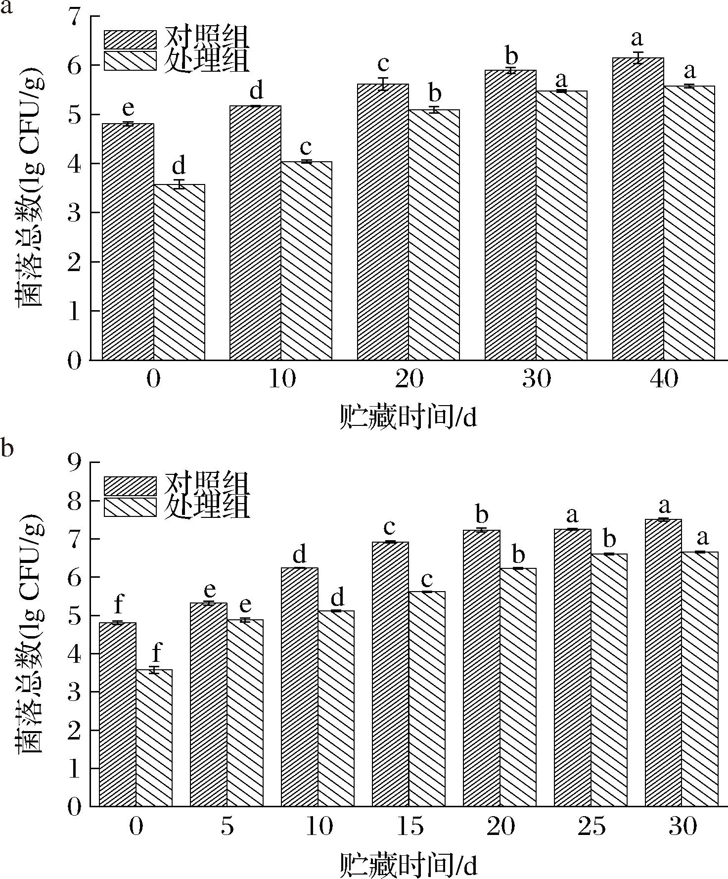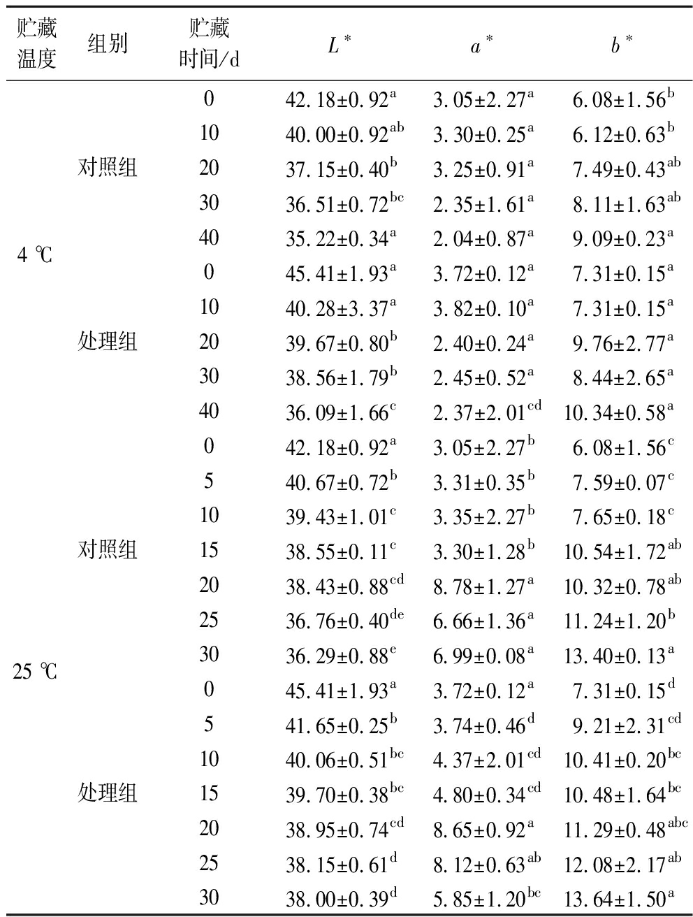 贮藏温度组别贮藏时间/dL∗a∗b∗4 ℃对照组处理组042.18±0.92a3.05±2.27a6.08±1.56b1040.00±0.92ab3.30±0.25a6.12±0.63b2037.15±0.40b3.25±0.91a7.49±0.43ab3036.51±0.72bc2.35±1.61a8.11±1.63ab4035.22±0.34a2.04±0.87a9.09±0.23a045.41±1.93a3.72±0.12a7.31±0.15a1040.28±3.37a3.82±0.10a7.31±0.15a2039.67±0.80b2.40±0.24a9.76±2.77a3038.56±1.79b2.45±0.52a8.44±2.65a4036.09±1.66c2.37±2.01cd10.34±0.58a25 ℃对照组处理组042.18±0.92a3.05±2.27b6.08±1.56c540.67±0.72b3.31±0.35b7.59±0.07c1039.43±1.01c3.35±2.27b7.65±0.18c1538.55±0.11c3.30±1.28b10.54±1.72ab2038.43±0.88cd8.78±1.27a10.32±0.78ab2536.76±0.40de6.66±1.36a11.24±1.20b3036.29±0.88e6.99±0.08a13.40±0.13a045.41±1.93a3.72±0.12a7.31±0.15d541.65±0.25b3.74±0.46d9.21±2.31cd1040.06±0.51bc4.37±2.01cd10.41±0.20bc1539.70±0.38bc4.80±0.34cd10.48±1.64bc2038.95±0.74cd8.65±0.92a11.29±0.48abc2538.15±0.61d8.12±0.63ab12.08±2.17ab3038.00±0.39d5.85±1.20bc13.64±1.50a