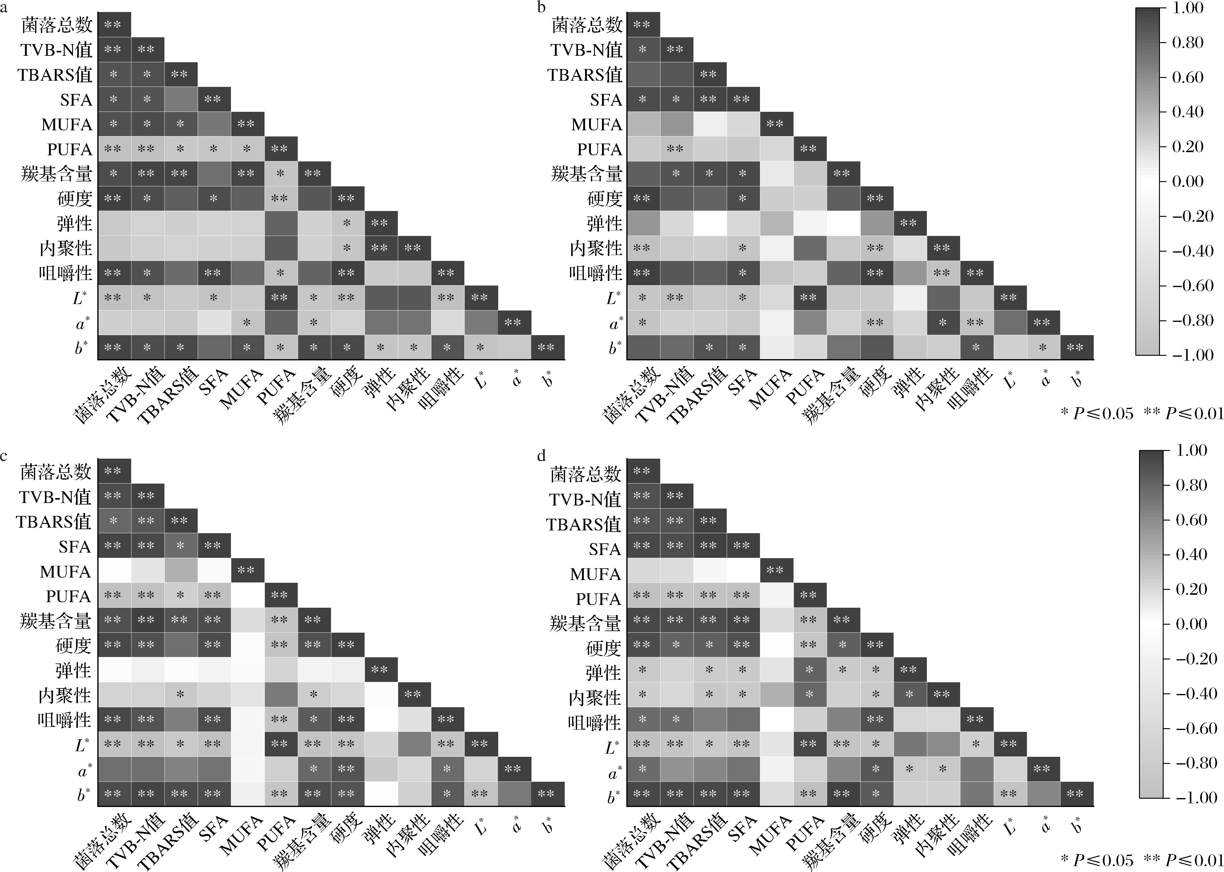 对2种贮藏温度下样品菌落总数、TVB-N值、TBARS值、脂肪酸组成、羰基含量、质构、色泽等关键指标进行了相关性分析,结果如图6所示。在4 ℃条件下,处理组中菌落总数与TVB-N值、SFA、硬度、咀嚼性均呈显著正相关(P<0.05)(图6-b),与内聚性、L*值和a*值呈显著负相关(P<0.05);TVB-N值与L*值、SFA、羰基含量呈显著正相关,与PUFA呈显著负相关(P<0.05);TBARS值与SFA、羰基含量及菌落总数呈显著正相关(P<0.05);SFA则与羰基含量、硬度、b*值和咀嚼性呈显著正相关;PUFA与L*值呈极显著正相关(P<0.05);硬度与咀嚼性呈极显著正相关,与内聚性和a*值呈显著负相关(P<0.05)。由此可知,处理组中TVB-N值与菌落总数关联性最强,主要因为贮藏过程中鱼肉中菌落数的增加,会促进蛋白质的降解,进而引起鱼肉TVB-N值的增加。而脂肪氧化和蛋白氧化与腌腊鱼的色泽和质构有极大关系,其中脂肪氧化会促进腌腊鱼亮度、a*值和b*值的提升,而蛋白氧化会通过交联作用促进鱼肉硬度增加,进而增强咀嚼性。对照组与处理组的相关性结果基本一致。25 ℃条件下的相关性热图分析与4 ℃条件基本一致,但是各组之间相关性分析更强,说明贮藏温度对腌腊鱼各品质指标有较大影响,这主要因为高温加速了各化学反应速率。总之,贮藏期间各品质指标都与CP处理和贮藏温度紧密相关。