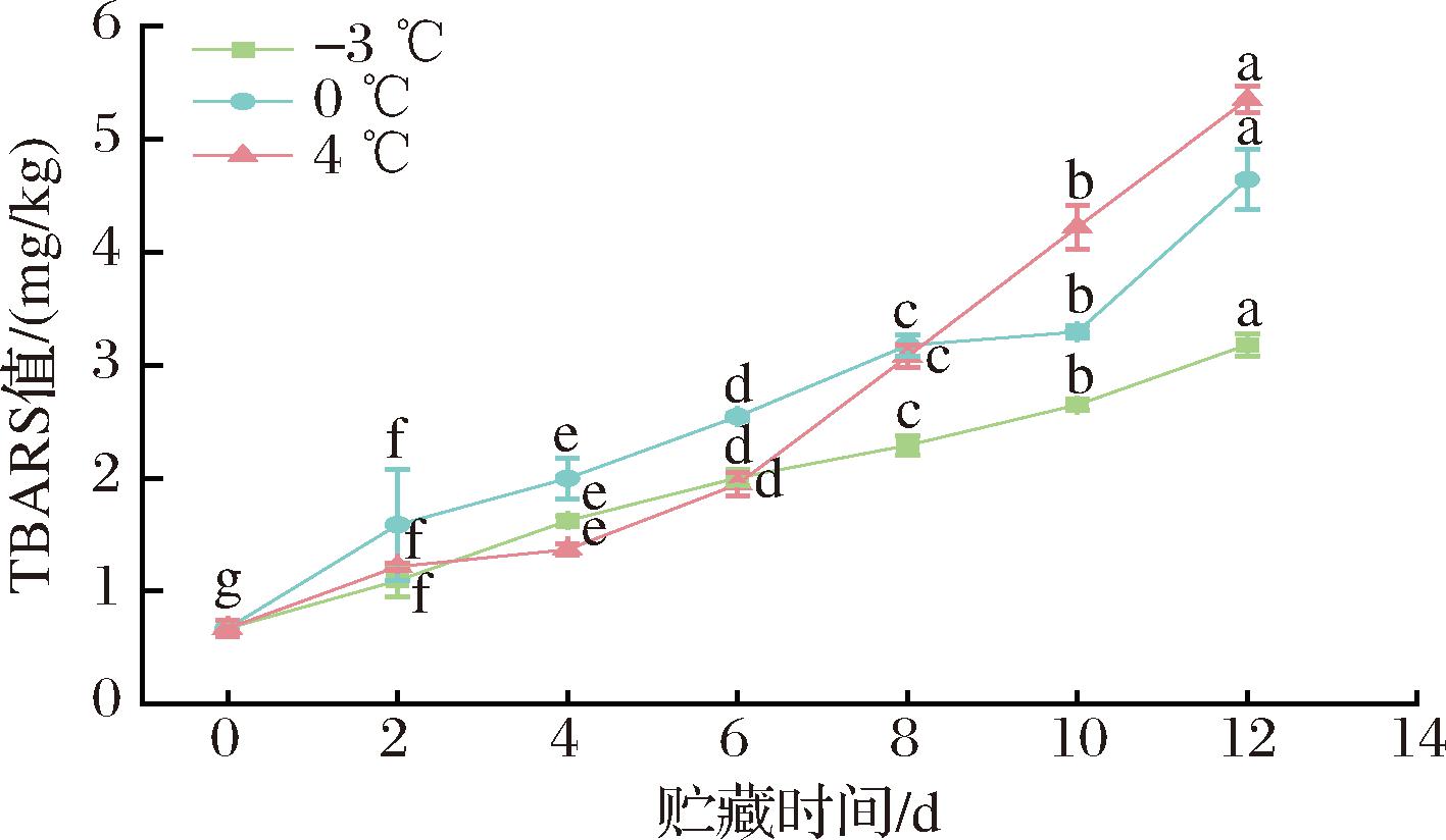 鸭肉相较于其他动物肉类,脂肪含量较低,但不饱和脂肪酸丰富,易被氧化。脂肪氧化会产生酸败味及氢过氧化物等有害物质,TBARS值反映了肉类中脂肪的氧化程度,是冷却肉品质评价的一个重要指标。由图5可知,TBARS值随着贮藏时间延长而增加,贮藏前期不同温度下的TBARS值差异不明显,在第8天后呈明显差异,且贮藏温度越高,鸭肉脂肪氧化速率越快。因此降低鸭肉的贮藏温度可以有效减缓其增速并延缓油脂氧化。贮藏前期,不同贮藏温度下鸭肉的TBARS值存在交叉部分,初步推测是由于包装方式使鸭肉与氧气有不同程度的接触,导致鸭肉氧化程度不一致[21,24]。