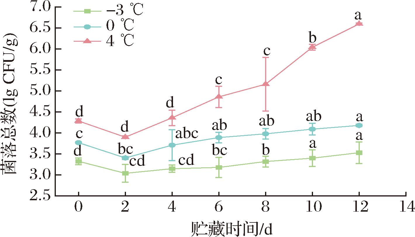 菌落总数是评价肉类产品品质和货架期的重要指标。如图1所示,不同贮藏温度(4、0、-3 ℃)对鸭肉菌落总数有显著影响(P<0.05)。在贮藏前期(0~2 d),3组菌落总数均略有下降,这是因为贮藏初期温度下降,微生物未能及时适应环境导致繁殖能力下降[9]。2 d后各组菌落总数随贮藏时间延长而增加,而0 ℃和-3 ℃贮藏的鸭肉菌落总数在整个贮藏期内均低于4 ℃贮藏组。同时,结果显示,4 ℃贮藏的鸭肉在8 d后菌落总数超过GB 16869—2005《鲜、冻禽产品》规定的限值(6.0 lg CFU/g),且表面覆盖大量黏液,颜色变为红褐色,产生明显的腐败异味,感官上不可接受,表明鸭肉已经发生腐败变质无法食用,而0 ℃和-3 ℃贮藏的鸭肉在12 d时菌落总数仅分别达到4.18 lg CFU/g和3.53 lg CFU/g,显著低于4 ℃贮藏组。结果表明,贮藏温度越低,鸭肉中微生物整体生长速率越慢,因此低温贮藏可以有效延长鸭肉的货架期[10]。这可能是由于微生物的新陈代谢需要酶的催化,随着温度的降低使得细菌细胞关键代谢酶结构改变或活性降低,达到抑制微生物增殖的效果[11]。