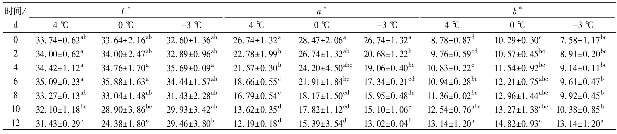 时间/dL∗a∗b∗4 ℃0 ℃-3 ℃4 ℃0 ℃-3 ℃4 ℃0 ℃-3 ℃033.74±0.63ab33.64±2.16ab32.60±1.36ab26.74±1.32a28.47±2.06a26.74±1.32a8.78±0.87d10.29±0.30c7.58±1.17bc234.00±0.62a34.00±2.47ab32.89±0.96ab22.78±1.99b26.74±1.32ab20.68±1.22b9.76±0.59cd10.57±0.45bc8.91±0.20bc434.42±1.12a34.76±1.70a35.69±0.09a21.57±0.30b24.20±4.50abc19.06±0.40bc10.83±0.22c11.54±0.92bc9.14±0.11bc635.09±0.23a35.88±1.63a34.44±1.57ab18.66±0.55c21.91±1.84bc17.34±0.21cd10.94±0.28bc12.21±0.75abc9.61±0.47b833.27±0.13ab33.04±1.48ab31.43±2.28ab16.79±0.54c18.17±1.50cd15.95±0.48de11.36±0.02bc12.96±1.44abc9.92±0.45b1032.10±1.18bc28.90±3.86bc29.93±3.42ab13.62±0.35d17.82±1.12cd15.10±1.06e12.54±0.76abc13.27±1.38abc10.38±0.85b1231.43±0.29c24.38±1.80c29.46±3.80b12.19±0.18d15.39±3.54d13.02±0.04f13.14±1.20a14.82±0.93a13.14±1.20a