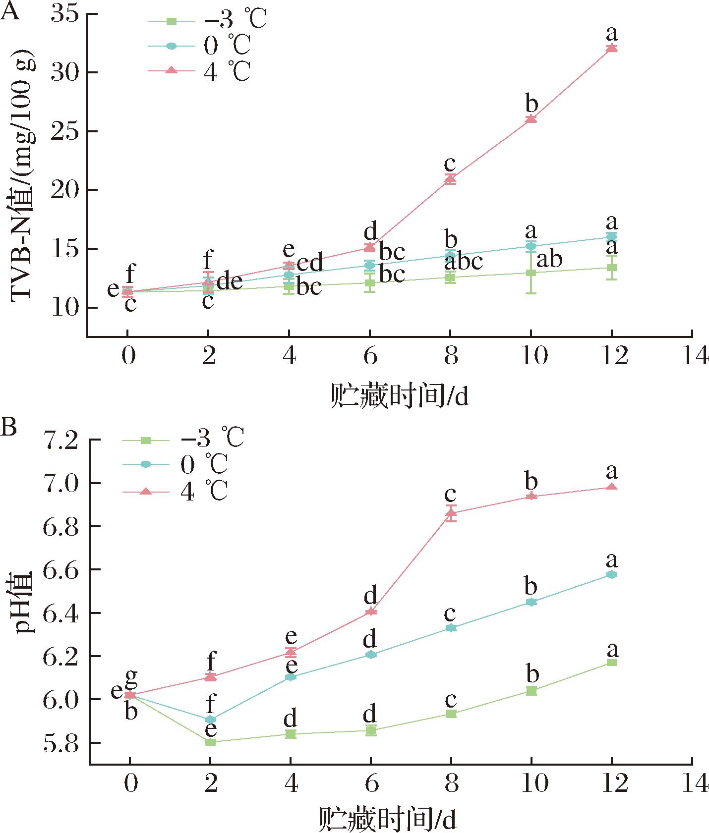 鸭肉贮藏过程中TVB-N值和pH值的变化如图2所示,在贮藏2 d后3组的TVB-N值呈显著性差异(P<0.05)。4 ℃贮藏6 d的鸭肉TVB-N值达到15.09 mg/100 g,超出GB 2707—2016《食品安全国家标准 鲜(冻)畜、禽产品》的要求限量15 mg/100 g,到8 d时肉已经发生腐败(TVB-N值达到20.91 mg/100 g)。0 ℃贮藏的鸭肉TVB-N含量在10 d达到15.21 mg/100 g,超过国标限量,到12 d时肉已腐败变质(TVB-N值达到16 mg/100 g)。根据2.1.1节菌落总数的结果,0 ℃贮藏的鸭肉在12 d未超过6.0 lg CFU/g的国标限值,但其TVB-N值在10 d达到15.21 mg/100 g,超过国标限量,因此,判断鸭肉品质及货架期要基于理化及微生物指标进行综合评价。-3 ℃贮藏的鸭肉在12 d贮藏期内未发生腐败。鸭肉贮藏过程中TVB-N值的变化可能与一磷酸腺苷和脱氨基作用释放出氨态氮有关,而二甲胺和三甲胺产生的量不大,所以前期TVB-N值上升缓慢,而后期微生物活动加强,大量的氨基酸被微生物分解,脱氨基作用加剧,导致TVB-N 值迅速增加。随着温度的降低,微生物活动变缓慢,导致相同贮藏时间内温度越低,TVB-N值越低[12-13]。因此,对于鸭肉来说在4 ℃下的货架期为6 d,降低温度可以有效延长鸭肉的贮藏期。