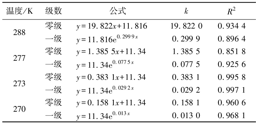 温度/K级数公式kR2288零级y=19.822x+11.81619.822 00.934 4一级y=11.816e0.2999x0.299 90.896 4277零级y=1.385 5x+11.341.385 50.851 8一级y=11.34e0.0775x0.077 50.925 6273零级y=0.383 1x+11.340.383 10.995 8一级y=11.34e0.0292x0.029 20.997 1270零级y=0.158 1x+11.340.158 10.960 6一级y=11.34e0.013x0.013 00.968 1