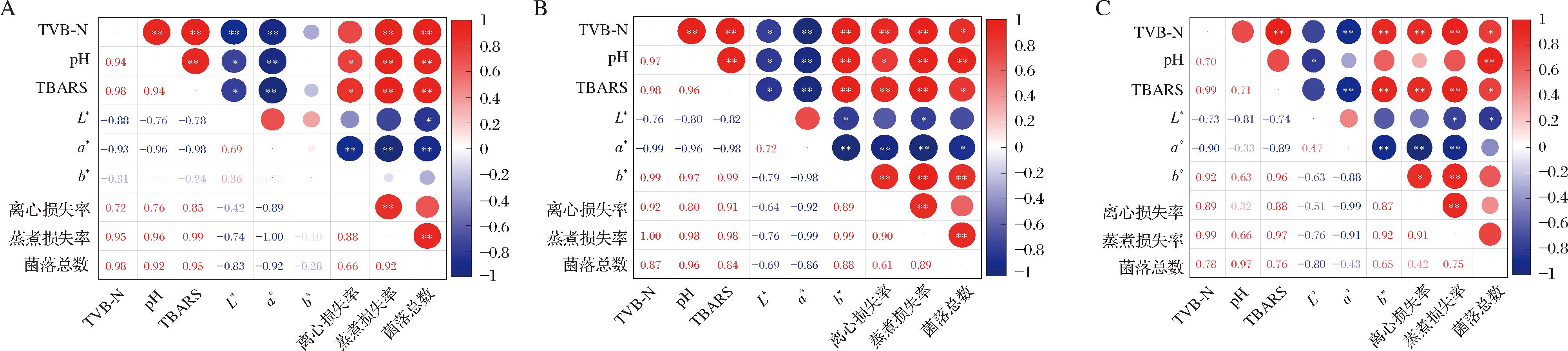 在-3 ℃贮藏条件下:a)主要参数除pH只与菌落总数显著正相关外(0.01水平),TVB-N、pH、TBARS、蒸煮损失率和离心损失率相互显著正相关。b)L*与pH、蒸煮损失率和菌落总数显著负相关(0.05水平);a*除与pH和菌落总数不相关外,与其他主要参数显著负相关(0.01水平);b*除与pH不相关外,与其他主要参数显著正相关。c)L*、 a*和b*之间,只有a*和b*显著负相关(0.01水平)[32-33]。