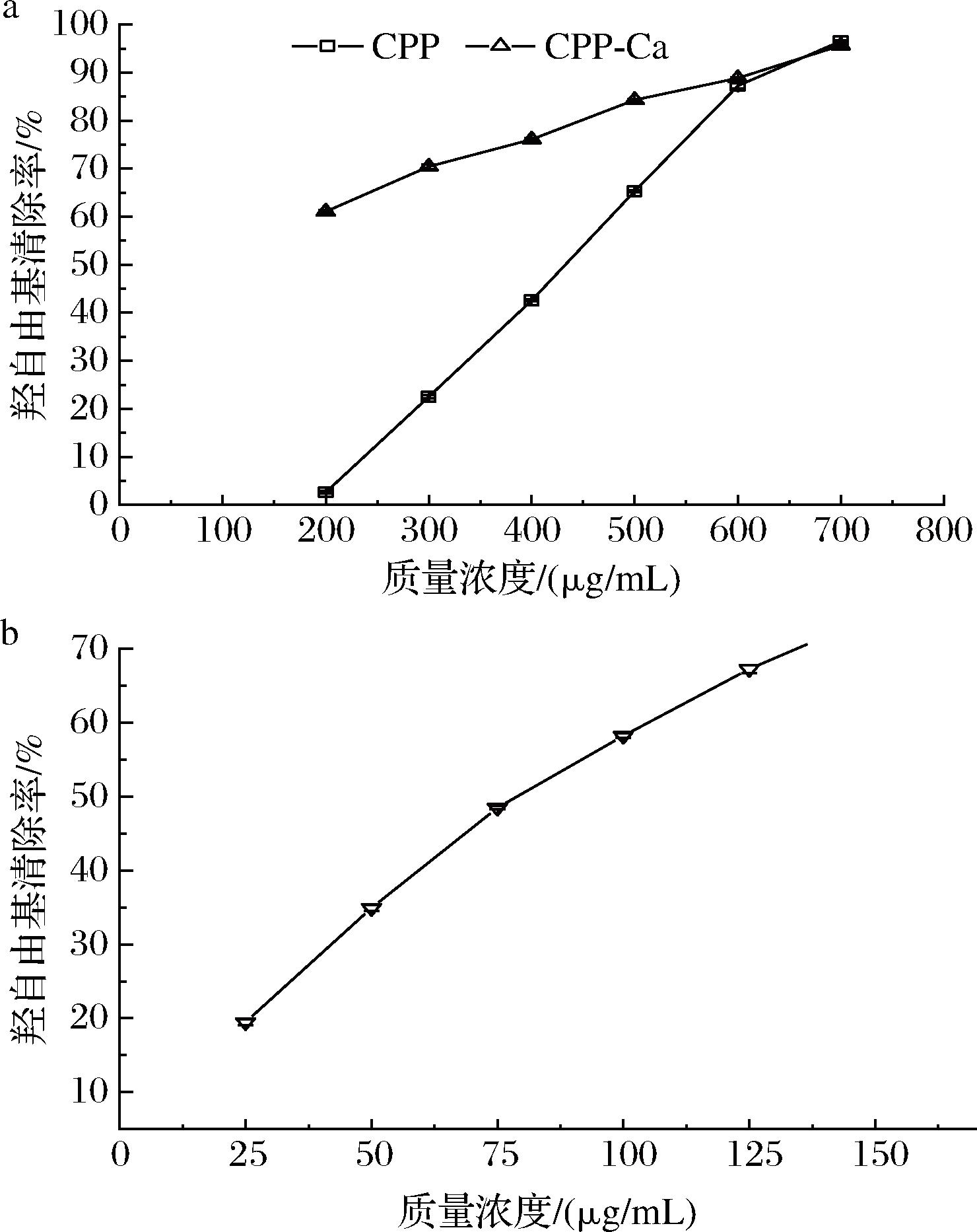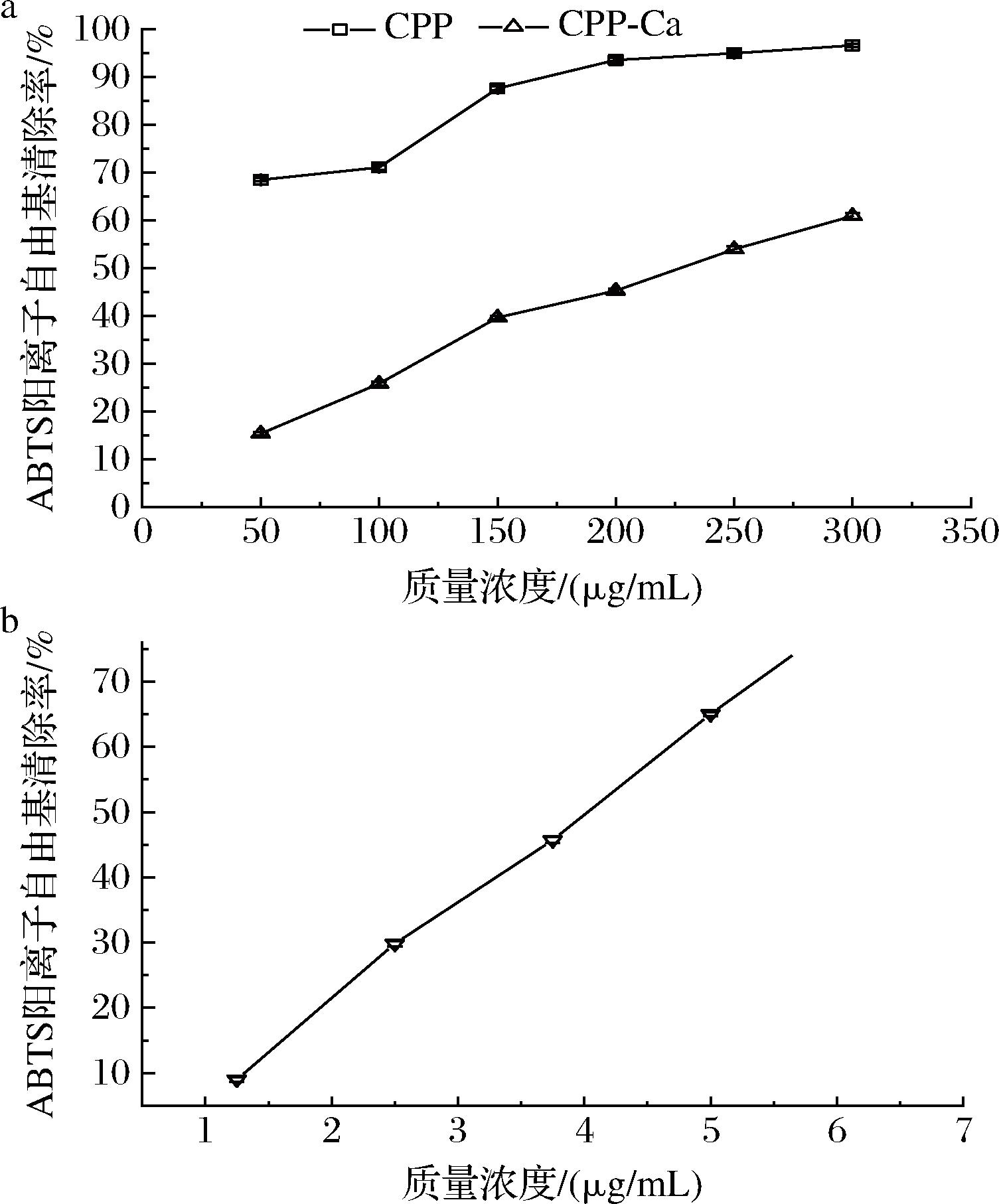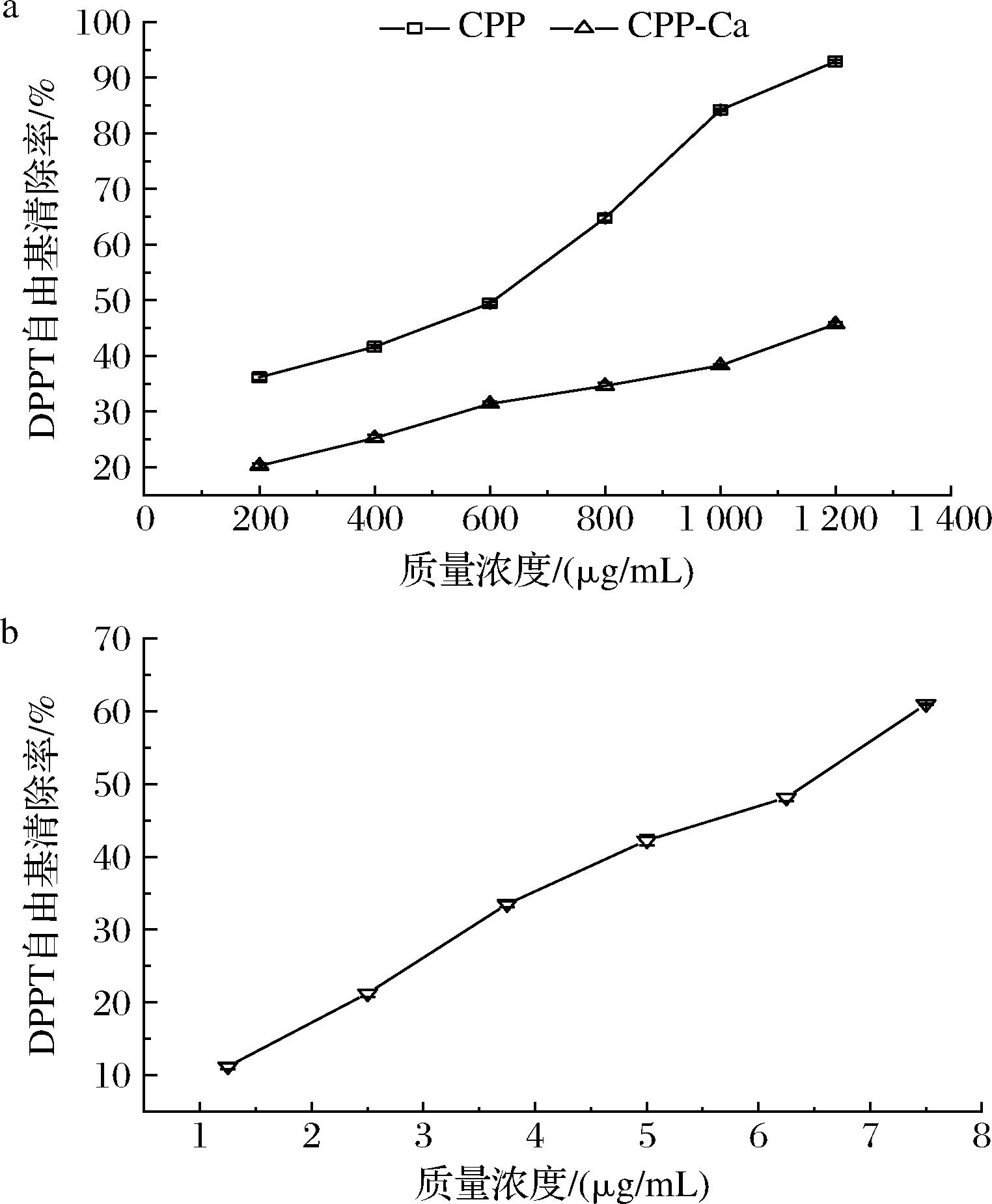 由图9-a可知,不同质量浓度的CPP与CPP-Ca对DPPH自由基的清除能力随着质量浓度的增大而提高,为浓度依赖型关系。在200~1 200 μg/mL的质量浓度范围内,CPP的DPPH自由基清除能力由36.17%上升至92.90%,而CPP-Ca的清除能力仅由20.27%上升至45.73%,显著低于螯合前。IC50是自由基清除率为50%时所对应的样品质量浓度,IC50越小,则清除自由基所消耗的样品越少,清除能力越强[38],本实验中,CPP的IC50为510.62 μg/mL,CPP-Ca在此范围未检测到IC50,图9-b为阳性对照抗坏血酸,其在1.25~7.5 μg/mL的IC50为6.16 μg/mL。对DPPH自由基清除能力的顺序为抗坏血酸>CPP>CPP-Ca。有研究发现疏水性氨基酸和芳香族氨基酸的含量与多肽的抗氧化能力有关[39],CPP的抗氧化能力显著强于CPP-Ca,与文献[40]报道的结果一致。