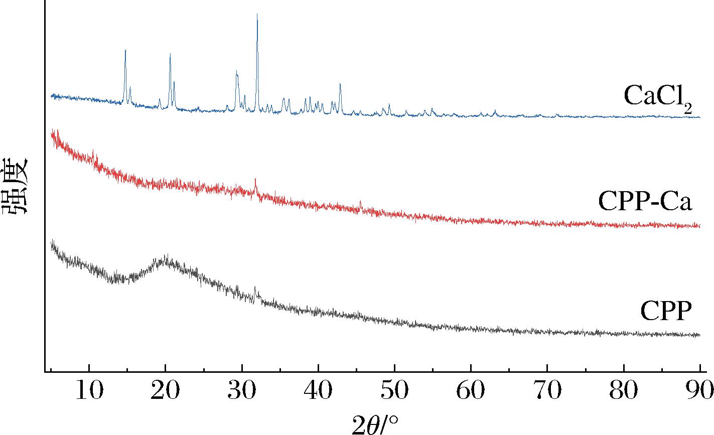 X射线衍射分析可用于分析物质粉末的晶体状态[35]。扫描结果如图5所示,螯合前后X射线衍射结果出现显著变化。CaCl2是CPP-Ca的钙离子来源,衍射图谱表明,其基线平整,在衍射角为11.74°、20.59°、29.30°、32.00°、42.85°等处表现出尖锐的强衍射峰,表明其结晶度较高。而CPP在衍射角为20.15°处有一个较宽的弥散峰,在31.72°处有一小的驼峰,该CPP为无规则的非晶型结构。在形成肽钙螯合物后,原来20.15°处弥散峰消失,仅31.77°处有一小的衍射峰。这表明CPP与钙离子通过化学作用形成了新的产物,表现出非晶型结构。