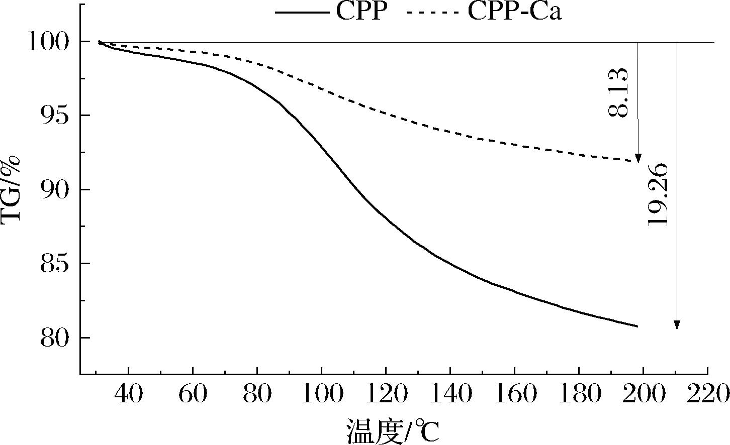 热重扫描TG(thermo-gravimetric)曲线表示随着温度的变化,样品质量百分比变化规律的曲线,结果如图8所示,螯合前后的样品在30~200 ℃的温度范围内出现了一个失重区,CPP的质量下降19.26%,CPP-Ca质量下降8.13%。热处理是食品加工的常用工艺,随着温度的升高,CPP-Ca的质量变化较小,说明CPP与钙离子螯合形成的产物对热更稳定,这与差示扫描量热分析的结果一致。