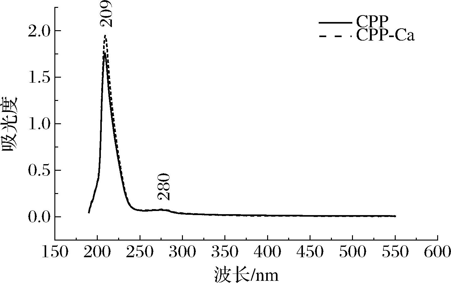 图3 CPP及CPP-Ca紫外吸收光谱图