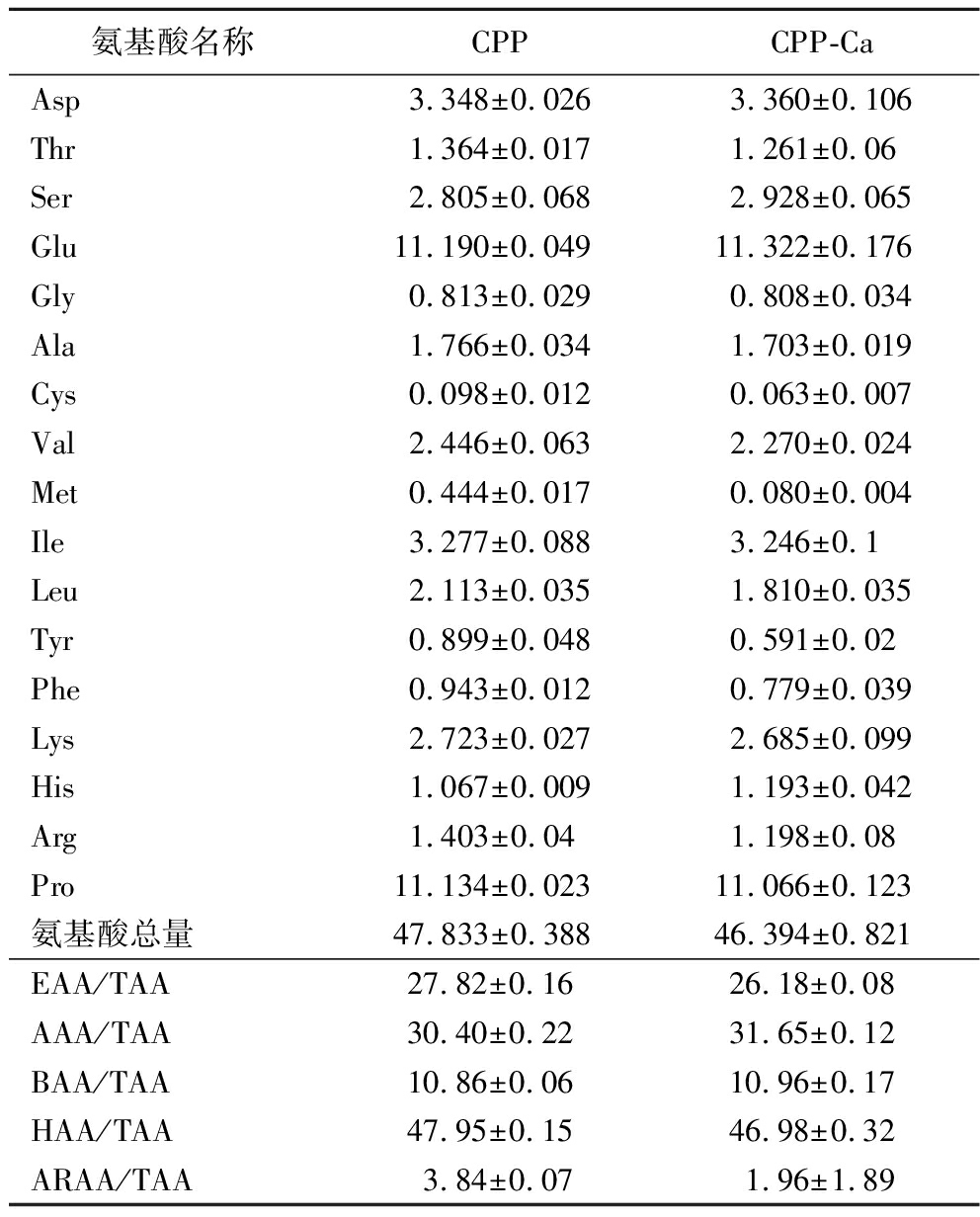 以酪蛋白为底物,利用贝莱斯芽孢杆菌所产的蛋白酶酶解制备CPP,CPP含量为47.9%,N/P为4.63±0.14。然后以CPP为原料制备CPP-Ca,CPP-Ca中钙的得率为26.20%。