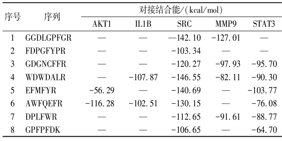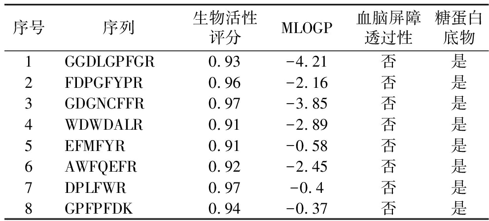 共筛选出8种潜在活性成分,如表1所示,它们的序列分别为GGDLGPFGR、FDPGFYPR、GDGNCFFR、WDWDALR、EFMFYR、AWFQEFR、DPLFWR、GPFPFDK。一般来说,生物活性评分值越大,生物活性越大[25],这8种潜在活性成分的活性评分值分别为0.93、0.96、0.97、0.91、0.91、0.92、0.97、0.94,它们具有较高的生物活性。MLOGP是用于预测物质在油水两相中的分配情况的参数,它反映了物质的亲脂性,当MLOGP值越小,说明该物质越亲水,反之,越大,则越亲油[26]。在药物设计中,MLOGP小于等于0通常意味着化合物具有较好的亲水性,这可能有助于药物的吸收和生物利用度,这8种潜在活性成分的MLOGP均小于0,分别为-4.21、-2.16、-3.85、-2.89、-0.58、-2.45、-0.4、-0.37,说明它们具有较好的亲水性。不具有血脑屏障透过性的物质在药物设计中具有特定优势,它们可能更适合作为局部治疗剂,能减少对中枢神经系统的潜在副作用,或可用于靶向非中枢神经系统的疾病[27]。此外,这些物质可能更容易控制剂量和减少全身性副作用,8种潜在活性成分均不具有血脑屏障透过性,可能在药物设计中具有特定的优势。糖蛋白底物可以被糖蛋白识别并从细胞中排出,这可能有助于减少药物在体内的积累,从而降低毒性和副作用,这8种潜在活性成分作为糖蛋白底物,可能有助于调节药物的体内过程,从而提高药物的疗效和安全性[28]。