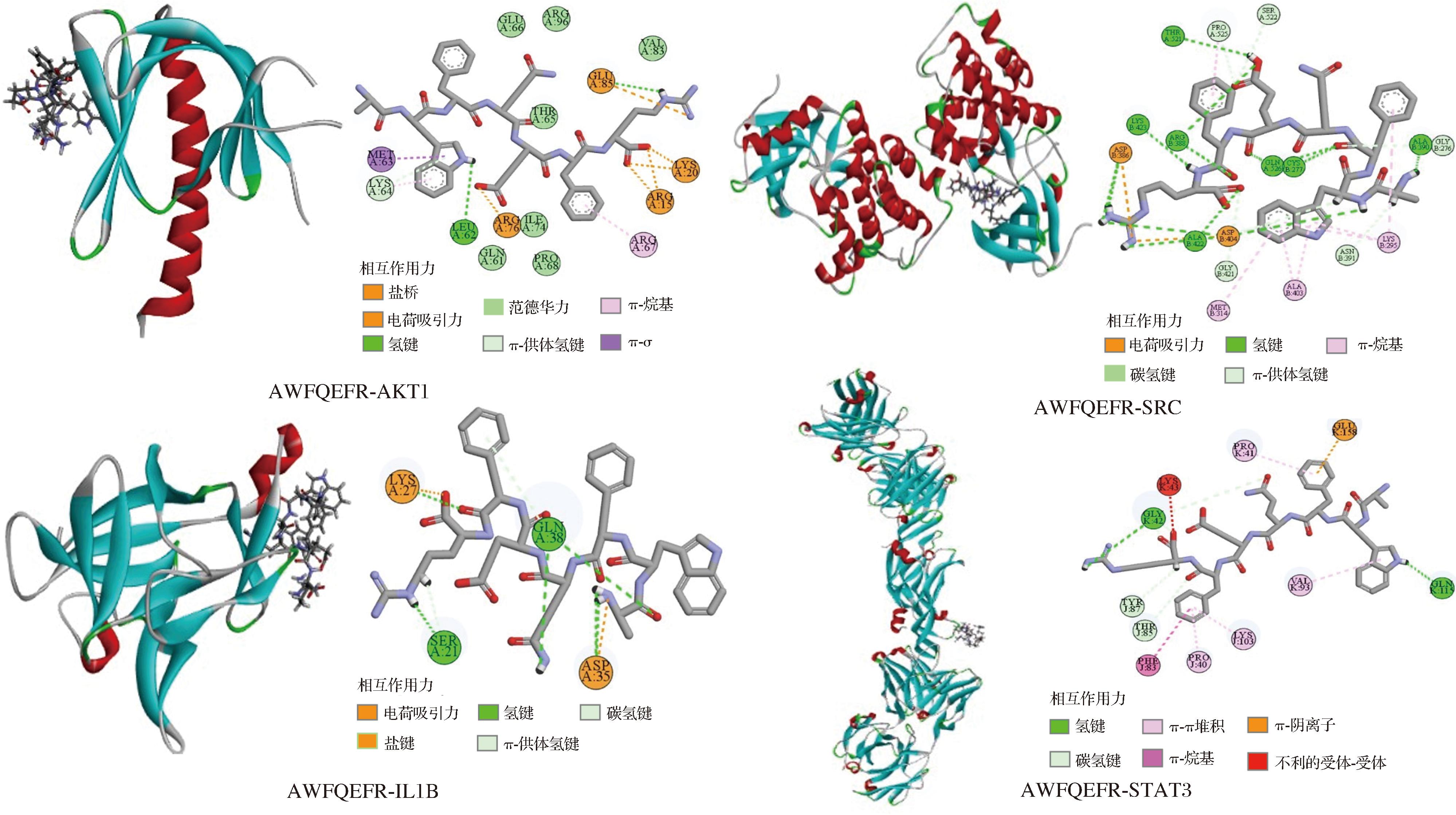 杜仲雄花多肽按照对接结合能从大到小排列为WDWDALR>AWFQEFR>GDGNCFFR>EFMFYR>DPLFWR>GGDLGPFGR>GPFPFDK>FDPGFYPR,其中,肽段AWFQEFR与AKT1、IL1B、SRC、STAT3核心靶点的总结合能最高,分别为-116.28、-102.51、-130.15、-76.084 kJ/mol,图4对其相互作用进行了展示。AWFQEFR与各靶点之间形成多种相互作用力,主要包括氢键(conventional hydrogen bond)、盐键(salt bridge)、静电吸引力(attractive charge)、范德华力(vander waals)、π-阴离子(π-anion)、π-烷基(π-akyl)、π-Sigma[18]。其中,氢键可以增强配体-受体复合物的稳定性和结合亲和力,如AWFQEFR与SRC中Thr521、Lys423、Arg388、Gln526、Cys277、Ala390、Ala422、Asp386、Asp404共9个氨基酸残基相互作用形成氢键,由此,推测AWFQEFR与SRC较强稳定性主要原因是氢键,其次与IL1B中Asp35、Lys27、Gln38、Ser21共4个氨基酸残基相互作用形成氢键,与AKT1中Leu62、Glu85形成氢键,与STAT3中Gly42、Gln115形成氢键。此外,AWFQEFR-AKT1中Glu85残基同时参与氢键、盐键、静电吸引力的形成,Lys64残基还参与范德华力的形成[18]。结果表明,AWFQEFR与各靶点的结合口袋均展现出良好的匹配性,具有进一步研究的潜力。