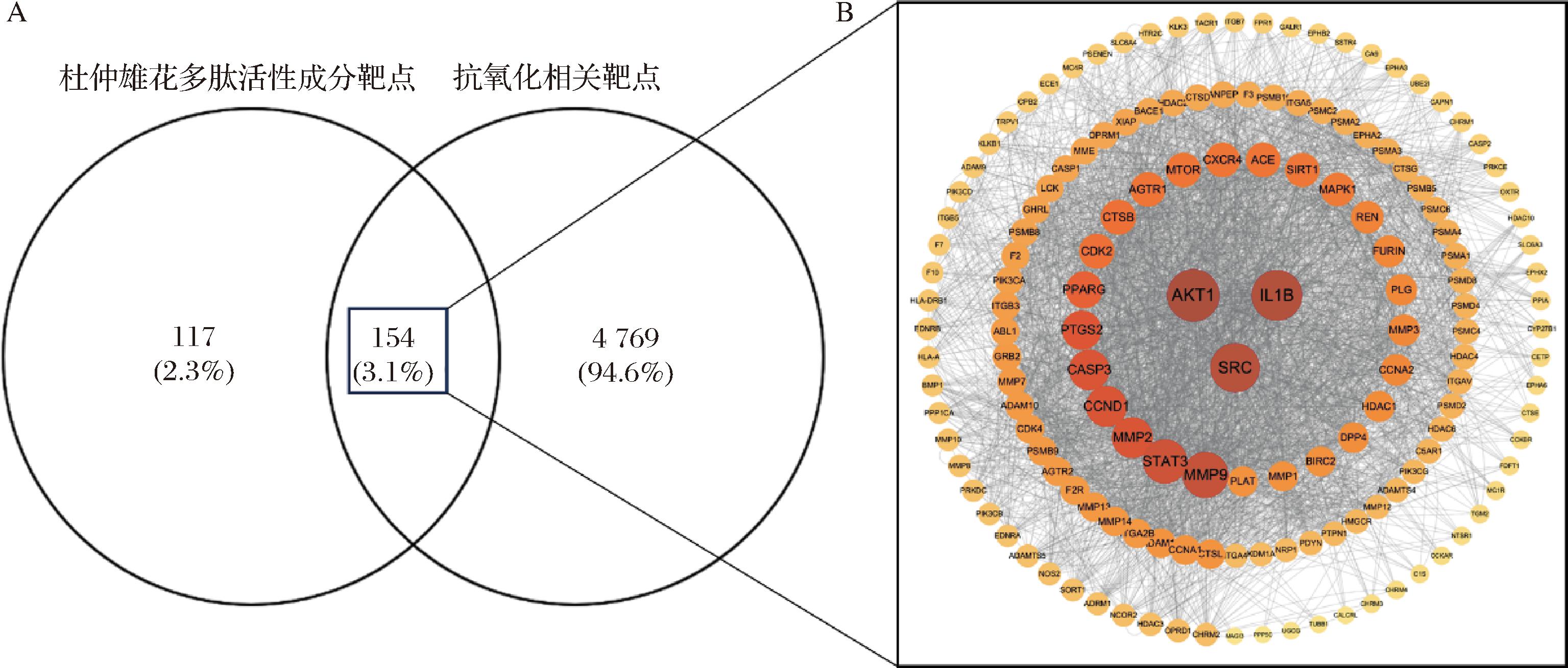 A-杜仲雄花多肽潜在活性成分靶点与抗氧化相关靶点交集韦恩图;B-杜仲雄花多肽抗氧化靶点蛋白PPI图