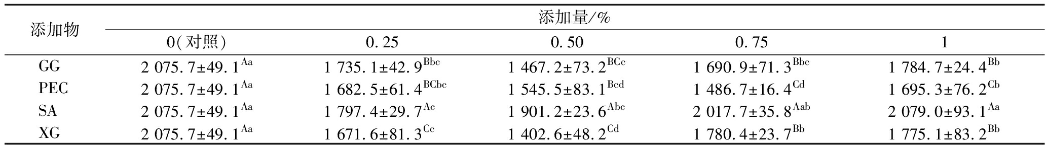 添加物添加量/%0(对照)0.250.500.751GG2 075.7±49.1Aa1 735.1±42.9Bbc1 467.2±73.2BCc1 690.9±71.3Bbc1 784.7±24.4BbPEC2 075.7±49.1Aa1 682.5±61.4BCbc1 545.5±83.1Bcd1 486.7±16.4Cd1 695.3±76.2CbSA2 075.7±49.1Aa1 797.4±29.7Ac1 901.2±23.6Abc2 017.7±35.8Aab2 079.0±93.1AaXG2 075.7±49.1Aa1 671.6±81.3Cc1 402.6±48.2Cd1 780.4±23.7Bb1 775.1±83.2Bb