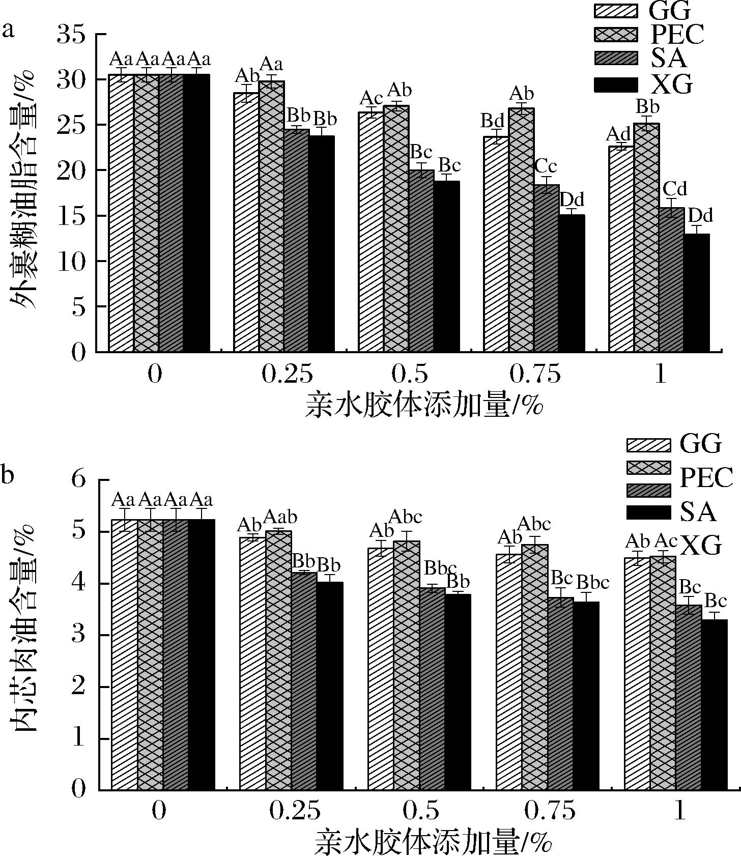 a-外裹糊油脂含量;b-内芯肉油脂含量