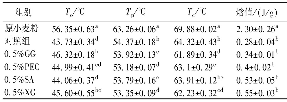 组别To/℃Tp/℃Tc/℃焓值/(J/g)原小麦粉56.35±0.63a63.26±0.06a69.88±0.02a2.30±0.26a对照组43.73±0.34d54.37±0.18b64.32±0.43b0.28±0.04b0.5%GG46.32±0.18b53.92±0.13c61.89±0.34d0.34±0.01b0.5%PEC44.99±0.41cd53.18±0.07d63.1±0.29c0.4±0.02b0.5%SA44.06±0.37d53.79±0.16c63.91±0.12bc0.53±0.05b0.5%XG45.60±0.55bc53.35±0.09d62.23±0.32cd0.55±0.03b