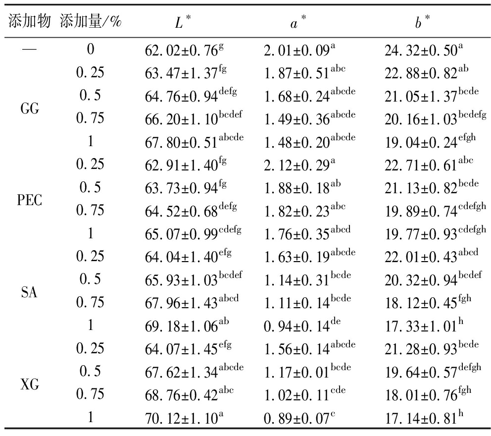 添加物添加量/%L∗a∗b∗—062.02±0.76g2.01±0.09a24.32±0.50a0.2563.47±1.37fg1.87±0.51abc22.88±0.82abGG0.564.76±0.94defg1.68±0.24abcde21.05±1.37bcde0.7566.20±1.10bcdef1.49±0.36abcde20.16±1.03bcdefg167.80±0.51abcde1.48±0.20abcde19.04±0.24efgh0.2562.91±1.40fg2.12±0.29a22.71±0.61abcPEC0.563.73±0.94fg1.88±0.18ab21.13±0.82bcde0.7564.52±0.68defg1.82±0.23abc19.89±0.74cdefgh165.07±0.99cdefg1.76±0.35abcd19.77±0.93cdefgh0.2564.04±1.40efg1.63±0.19abcde22.01±0.43abcdSA0.565.93±1.03bcdef1.14±0.31bcde20.32±0.94bcdef0.7567.96±1.43abcd1.11±0.14bcde18.12±0.45fgh169.18±1.06ab0.94±0.14de17.33±1.01h0.2564.07±1.45efg1.56±0.14abcde21.28±0.93bcdeXG0.567.62±1.34abcde1.17±0.01bcde19.64±0.57defgh0.7568.76±0.42abc1.02±0.11cde18.01±0.76fgh170.12±1.10a0.89±0.07c17.14±0.81h