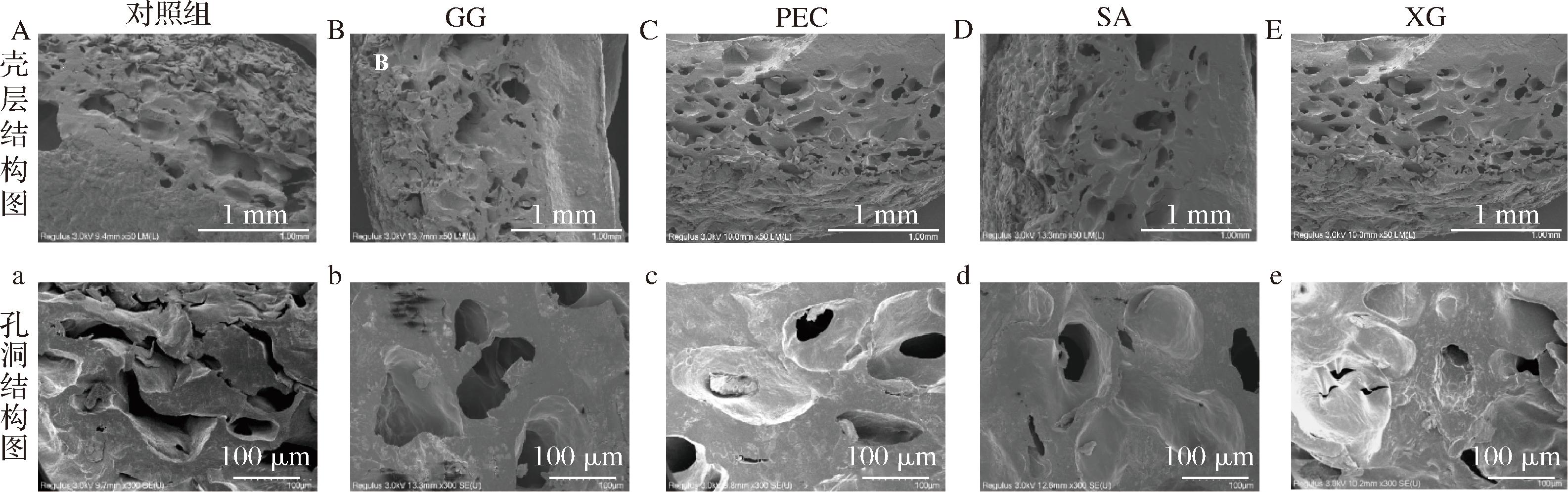 A~B分别代表对照组、0.5%GG、0.5%PEC、0.5%SA和0.5%XG样品截断面壳层结构图(50×);a~b分别代表对照组、0.5%GG、0.5%PEC、0.5%SA和0.5%XG样品截断面孔洞结构图(300×)