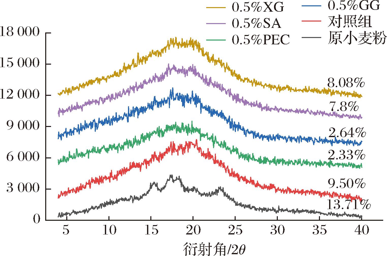 未经油炸处理的原小麦粉和添加不同亲水胶体油炸处理的外裹糊的XRD图谱及相对结晶度如图6所示。原小麦粉呈现为A型晶体峰特征,在15°、23°左右出现2个较强的衍射峰,同时在17°、18°左右有2个重叠的连续峰,此外在20°附近还出现1个弱结晶峰,呈现V型结晶峰特征,说明原小麦粉中存在微少淀粉-脂质复合物[19-20]。经过油炸处理酥肉外裹糊后,样品的XRD图谱发生显著变化,原有的衍射峰强度降低,且在20°附近衍射峰增强,同时相对结晶度也发生明显改变,说明油炸处理后样品中双螺旋结构形成的结晶区破坏,同时,在高温过程中形成了淀粉-脂质复合物,样品逐渐转化为A+V型结晶结构,相对结晶度由原来的13.71%急剧下降到9.5%。