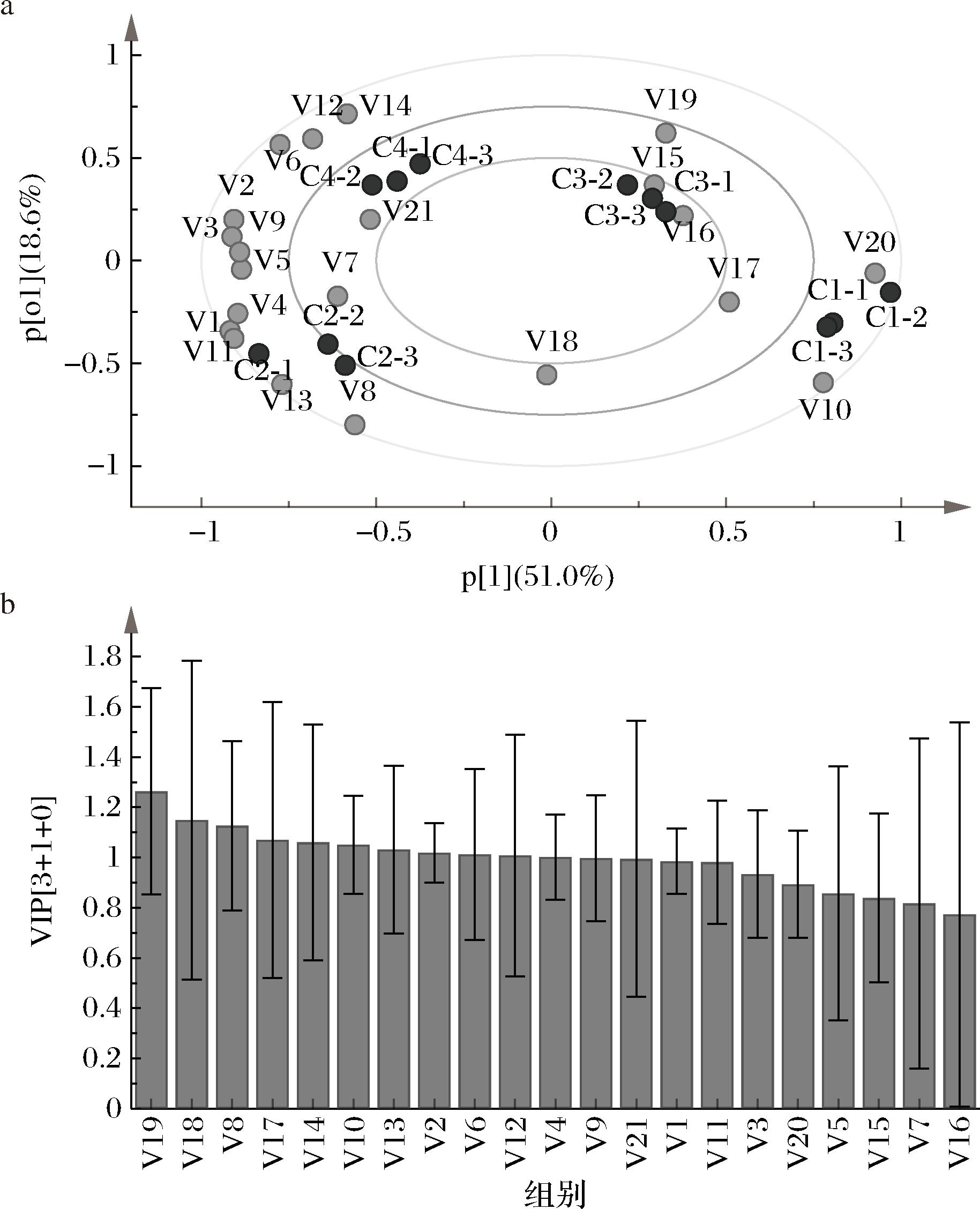 a-OPLS-DA模型;b-挥发性物质的VIP值