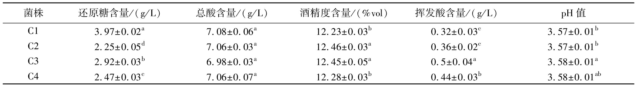 菌株还原糖含量/(g/L)总酸含量/(g/L)酒精度含量/(%vol)挥发酸含量/(g/L)pH值C13.97±0.02a7.08±0.06a12.23±0.03b0.32±0.03c3.57±0.01bC22.25±0.05d7.06±0.03a12.46±0.03a0.36±0.02c3.57±0.01bC32.92±0.03b6.98±0.03a12.45±0.05a0.5±0.04a3.58±0.01aC42.47±0.03c7.06±0.07a12.28±0.03b0.44±0.03b3.58±0.01ab