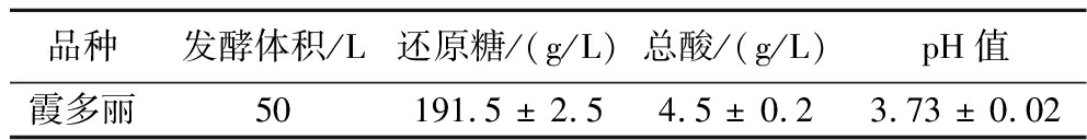 品种发酵体积/L还原糖/(g/L)总酸/(g/L)pH值霞多丽50191.5 ± 2.54.5 ± 0.23.73 ± 0.02