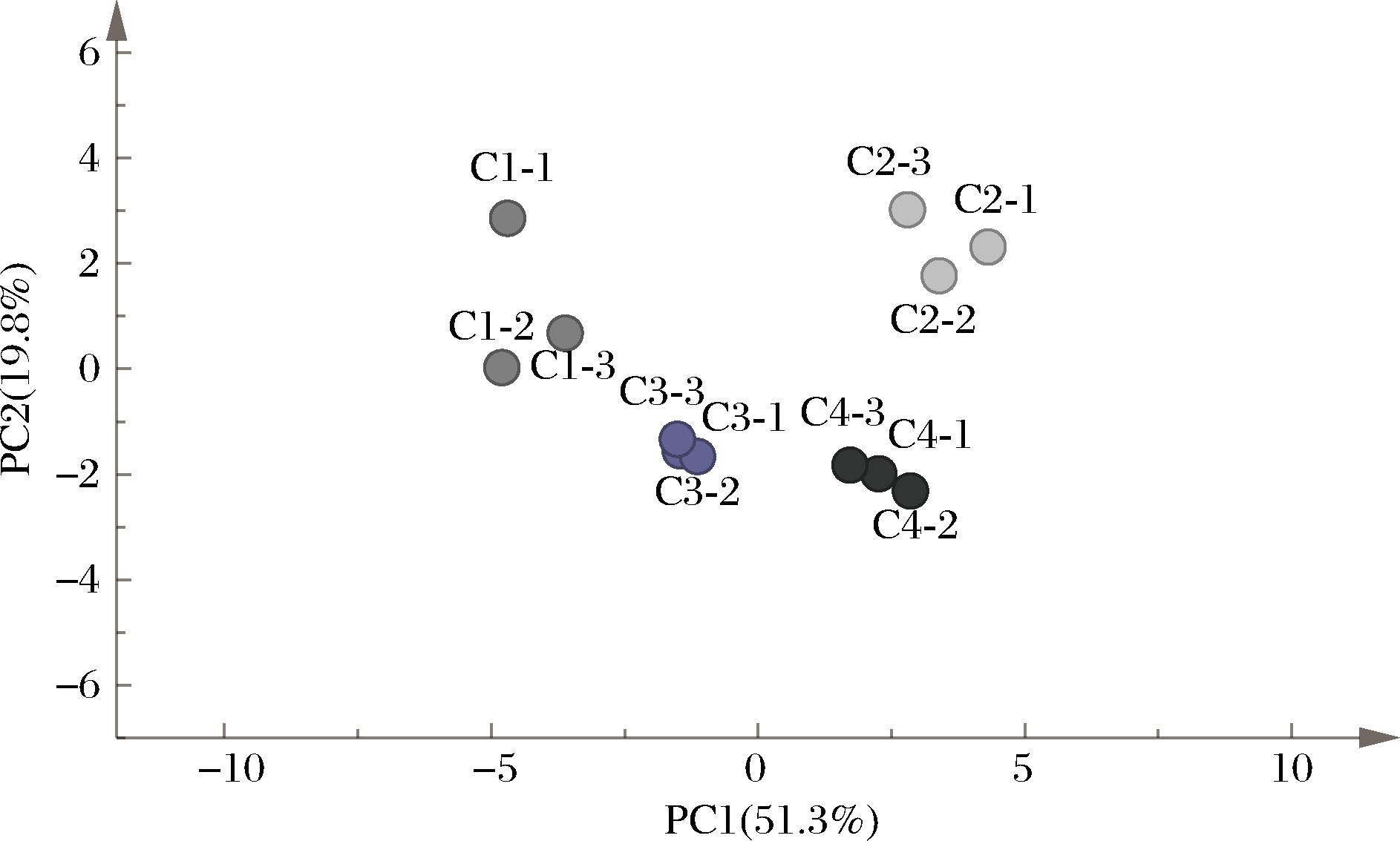 产香酿酒酵母发酵酒样的主要电子鼻响应类别共五类,分别是短链烷类,萜烯类、无机硫化物,乙醇、醇、醛、酮,芳烃、有机硫化物和氮氧化物(图3)。C2和C4酒样的短链烷类,芳烃、有机硫化物和氮氧化物含量较高,这可能预示着葡萄酒有一定的风味缺陷。C1和C4酒样的萜烯类、无机硫化物含量较高,C2和C3的乙醇、醇、醛、酮含量较高,这与HS-SPME-GC-MS检测的挥发性物质的结果一致。