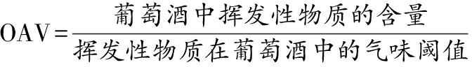 使用HS-SPME-GC-MS对葡萄酒中的挥发性物质进行测定[8]。将5 mL葡萄酒样品、1.2 g 氯化钠和10 μL 1.003 g/L的4-甲基-2-戊醇内标加入20 mL顶空瓶中,旋紧瓶盖后置于样品盘,测定参数设置参考商浥等的方法[9]。将香气标准品融于模拟葡萄酒[14 %vol乙醇,7.5 g/L酒石酸,pH=3.3~3.4]中制备标准曲线,并加入10 μL内标,检测方法与上述方法一致。葡萄酒样品中的挥发性化合物通过与参考标准品的保留指数比对,并与NIST17.0数据库的质谱图匹配进行鉴定。通过建立纯标准品的标准曲线计算化合物浓度用于下游数据分析。采用OAV评估挥发性化合物对葡萄酒香气轮廓的贡献,其计算(1)所示[10]。挥发性物质的嗅觉特征和阈值水平根据早期研究确定[11-13]。