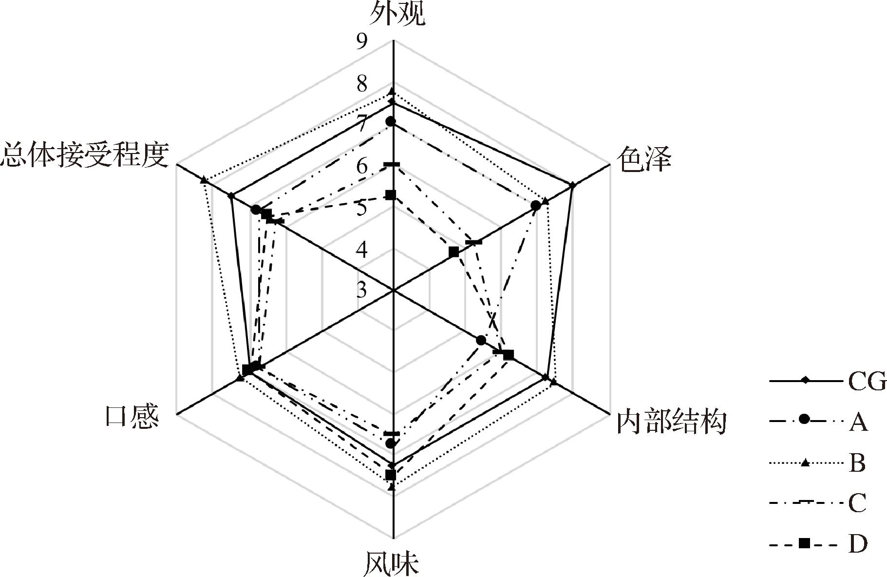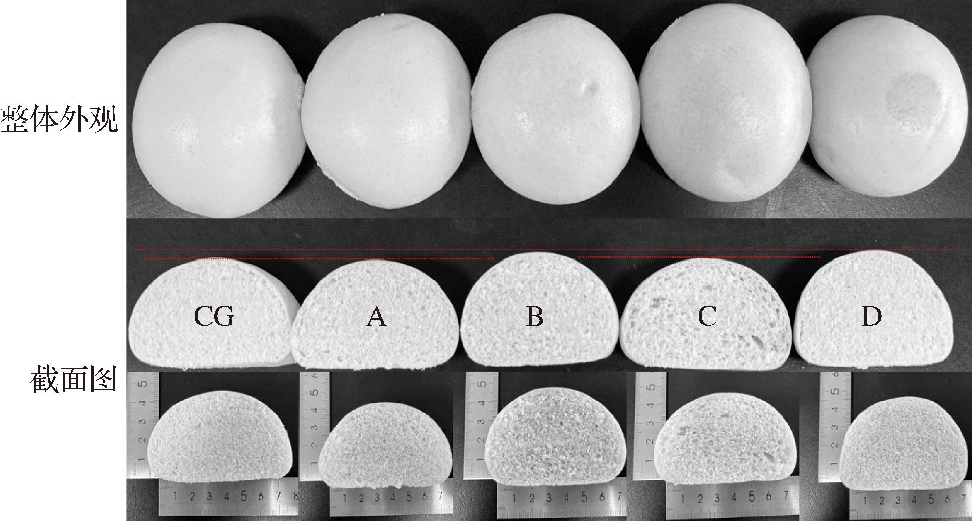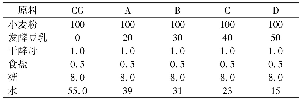 注:CG为普通馒头A、B、C、D分别代表发酵豆乳添加量为20%、30%、40%、50%(质量分数,以小麦粉质量计)的馒头(下同);水的添加量根据发酵豆乳固形物含量进行调整,确保每组加水量相同。