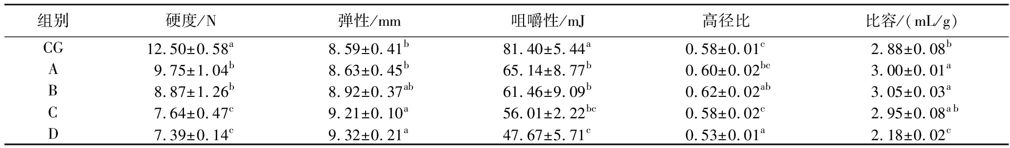 组别硬度/N弹性/mm咀嚼性/mJ高径比比容/(mL/g)CG12.50±0.58a8.59±0.41b81.40±5.44a0.58±0.01c2.88±0.08bA9.75±1.04b8.63±0.45b65.14±8.77b0.60±0.02bc3.00±0.01aB8.87±1.26b8.92±0.37ab61.46±9.09b0.62±0.02ab3.05±0.03aC7.64±0.47c9.21±0.10a56.01±2.22bc0.58±0.02c2.95±0.08abD7.39±0.14c9.32±0.21a47.67±5.71c0.53±0.01a2.18±0.02c