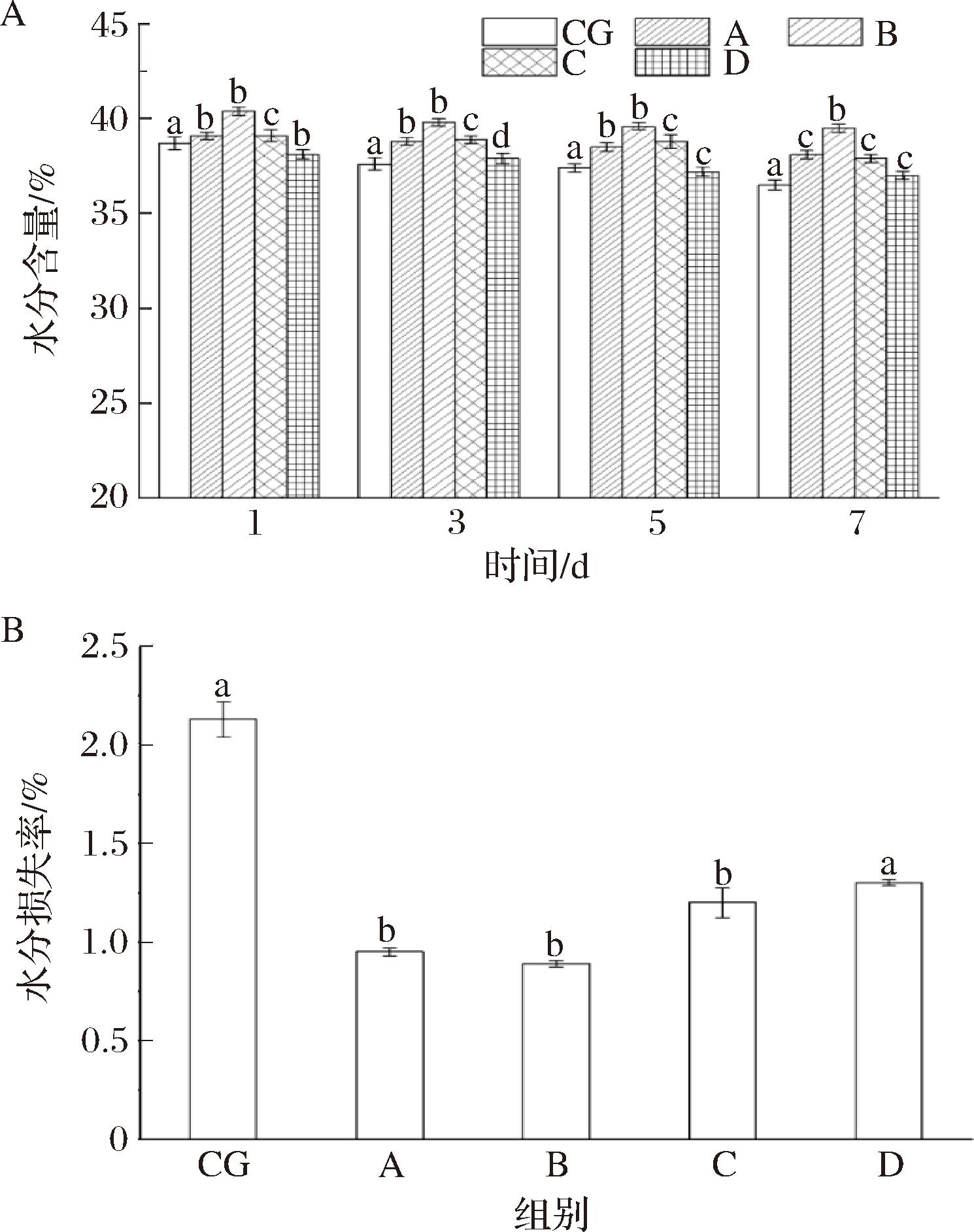 A-水分含量的变化;B-水分损失率的变化