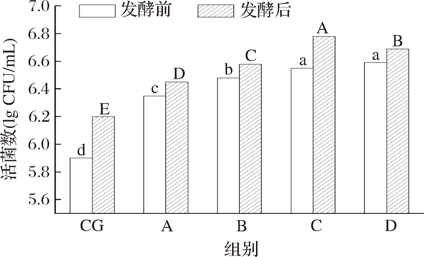 由图3可以看出,添加发酵豆乳后面团中的乳酸菌活菌数均显著提高(P<0.05),且随着发酵豆乳添加量的增加呈升高趋势,C组和D组无显著性差异(P>0.05);面团发酵后,各组面团的活菌数均显著增加,其中C组活菌数最高,为6.79 lg CFU/mL,说明乳酸菌被发酵豆乳引入面团后保持了良好的生长状态,在面团中继续增殖[4];当发酵豆乳添加量达到40%时面团的活菌数已经达到较高水平,再增加时面团中活菌数的提升不显著(P>0.05)。