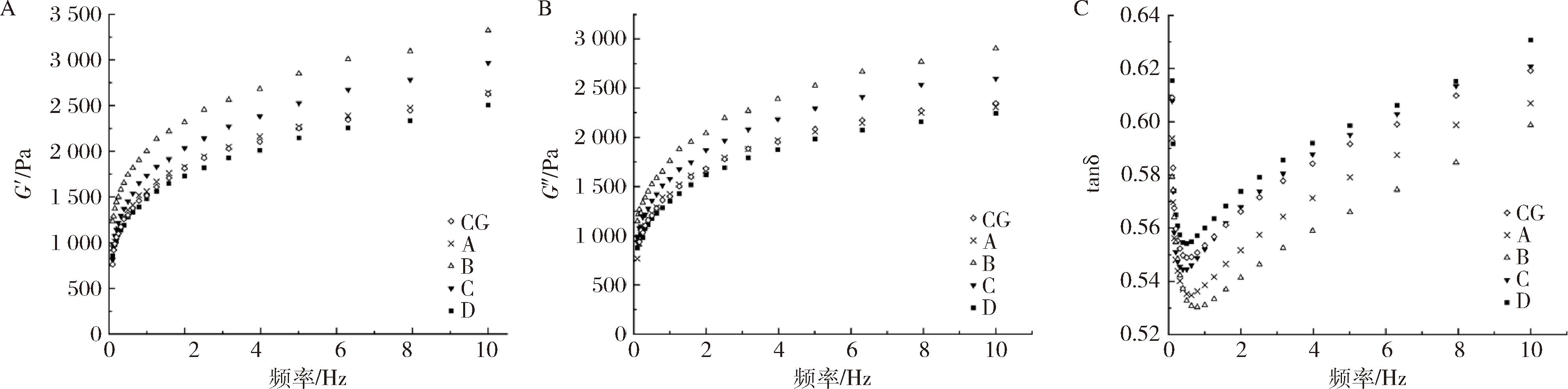 A-弹性模量(G′)的变化曲线;B-黏性模量的变化曲线(G″);C-损耗因子(tanδ)的变化曲线