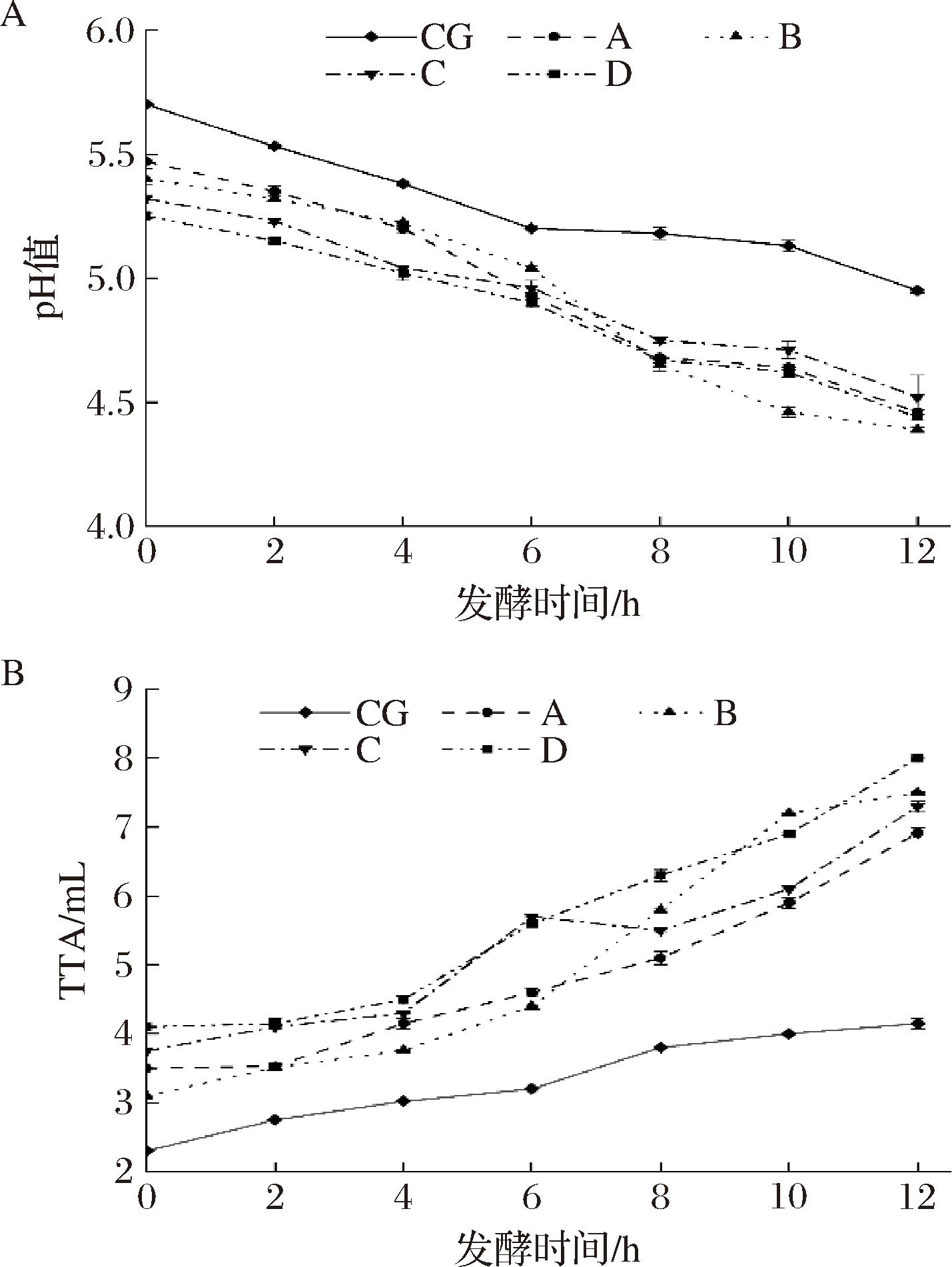 A-面团发酵过程中pH值的变化;B-面团发酵过程中TTA的变化