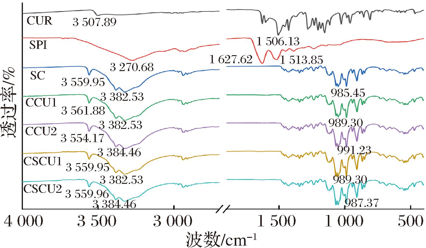 利用红外光谱表征共结晶产物分子间互作和化学结构的变化。如图3所示,SC在3 559.95 cm-1和3 382.53 cm-1处形成强而尖锐的峰,这主要表示蔗糖晶体分子间和分子内羟基(O—H)引起的伸缩振动;CUR的特征峰则包括3 507.89 cm-1处由酚羟基(O—H)和1 506.13 cm-1处由姜黄素苯环(C