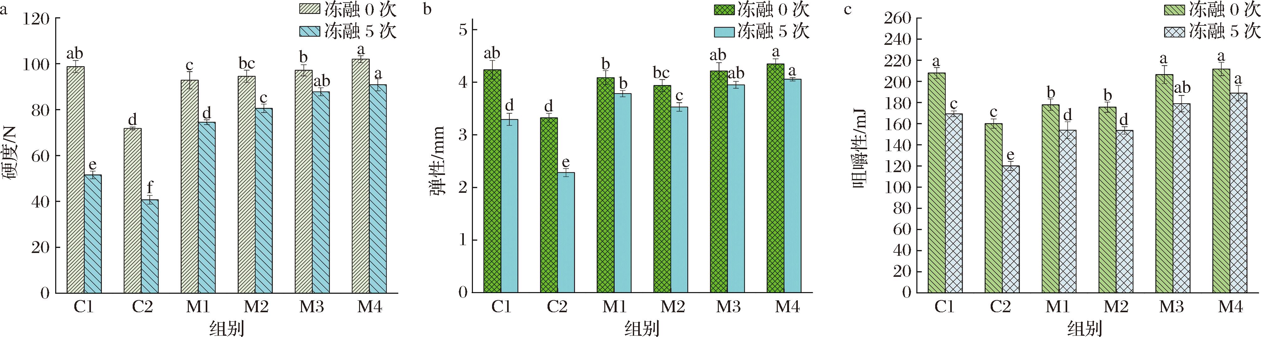 图6 功能复合型蔗糖共结晶的添加与反复冻融对低脂猪肉丸质构特性的影响