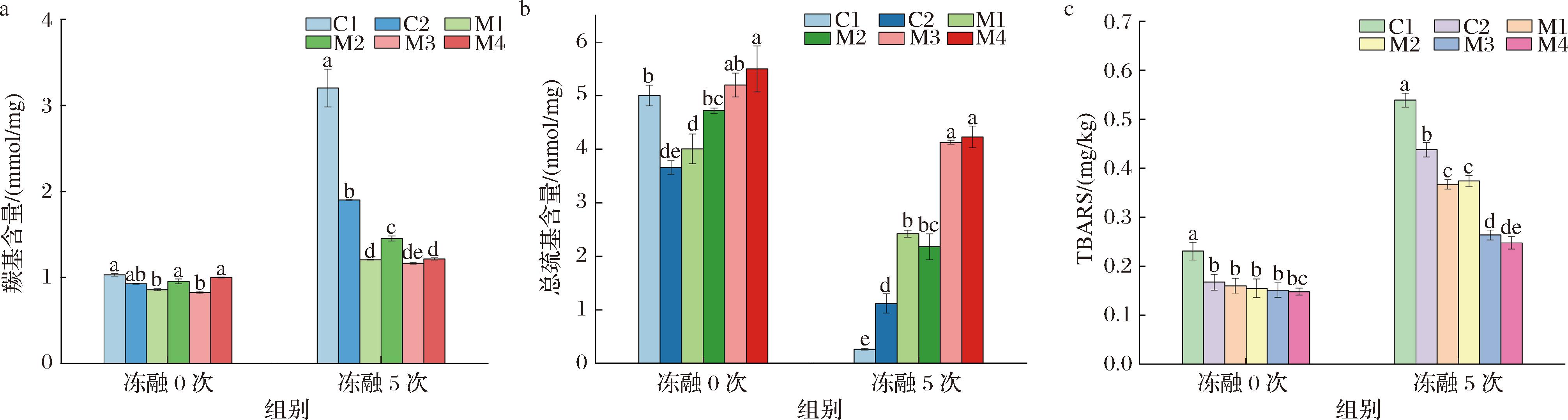 羰基和巯基含量是评价肉类蛋白氧化的重要指标[23],由图8-a可知,所有样品的羰基含量在冻融后均有一定程度的升高,其中C1的升幅最大,C2次之,而添加功能型蔗糖共结晶对减少羰基的形成具有积极作用,主要归因于共结晶中的酚类化合物能够有效抑制羰基的生成,与TURGUT等[24]研究一致。图8-b显示在未添加蔗糖共结晶的情况下,C1和C2的总巯基含量在5次冻融后降到较低值,主要由于冰晶的反复生长导致了促氧化因子的形成,使得含硫氨基酸受到氧化[25]。冻融后,M3和M4的总巯基含量仍处于较高值,两者无显著差异(P>0.05),表明CSCU的添加可较好地抑制冰晶生长,从而抑制巯基的冷冻氧化产生二硫键。猪肉丸TBARS含量的变化趋势与羰基结果较为一致(图8-c),由于脂肪含量较高,冻融后C1的TBARS值显著高于其他样品组(P<0.05),而添加CSCU后,M3和M4的TBARS值升幅较小,显示出较低的脂质氧化率。综合看来,与直接减脂和添加CCU相比,CSCU的添加能更好地抑制低脂猪肉丸在冻融过程中的氧化反应。